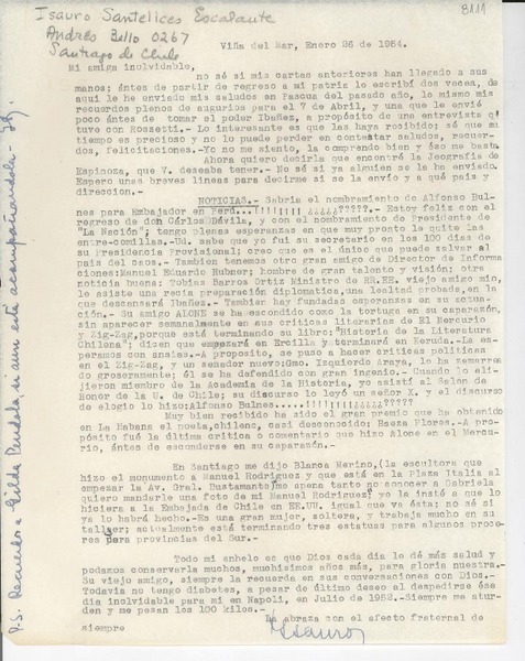 [Carta] 1954 ene. 26, Viña del Mar, [Chile] [a] [Gabriela Mistral] [manuscrito] Isauro Santelices Escalante.