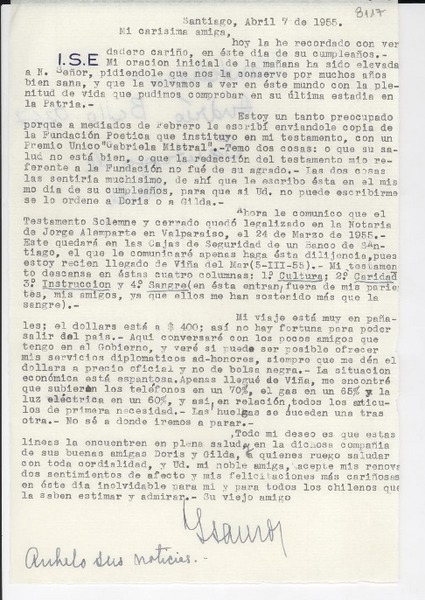 [Carta] 1955 abr. 7, Santiago, [Chile] [a] [Gabriela Mistral] [manuscrito] Isauro [Santelices].