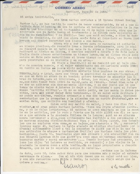 [Carta] 1955 mayo 22, Santiago, [Chile] [a] [Gabriela Mistral] [manuscrito] Isauro [Santelices Escalante].