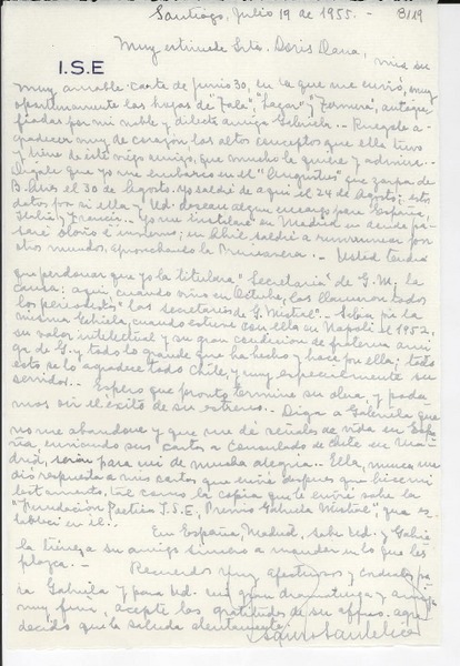 [Carta] 1955 jul. 19, Santiago, [Chile] [a] Doris Dana [manuscrito] Isauro Santelices.