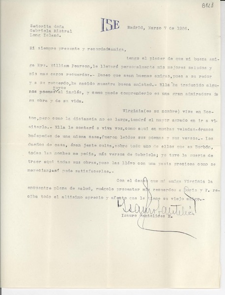 [Carta] 1956 mar. 7, Madrid [a] Gabriela Mistral, Long Island [manuscrito] Isauro Santelices E.