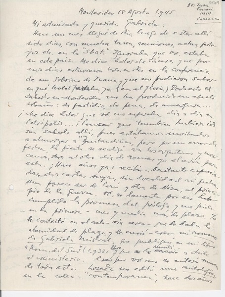 [Carta] 1945 ago. 18, Montevideo, [Uruguay] [a] Gabriela [Mistral] [manuscrito] Fernán Silva Valdés.