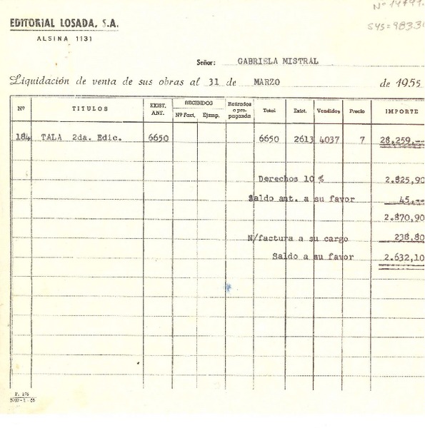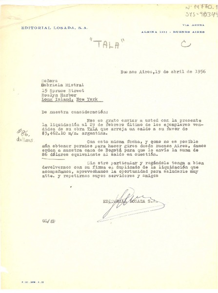 [Carta] 1956 abr. 19, Buenos Aires, [Argentina] [a] Gabriela Mistral, Roslyn Harbor, New York, (U.S.A.) [manuscrito] Editorial Losada.