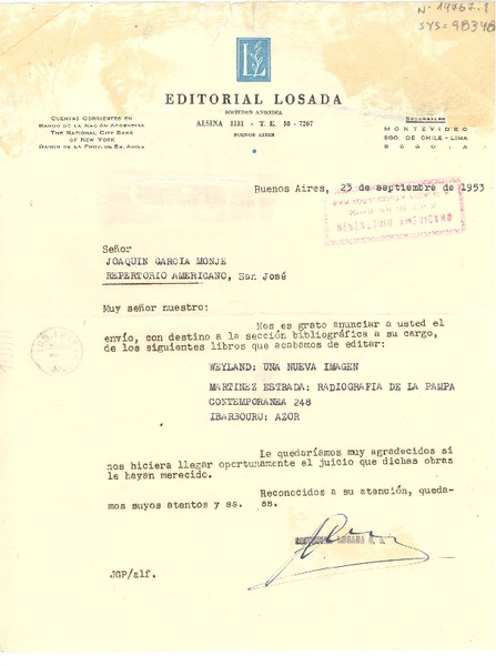 [Carta] 1953 abr. 18, Buenos Aires, [Argentina] [a] Joaquín García Monje, San José [manuscrito] [Editorial Losada].
