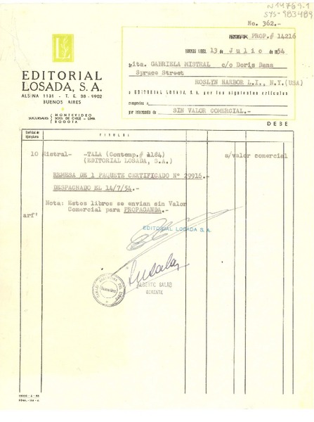 [Recibo] 1954 jul. 13, Buenos Aires, [Argentina] [a] Gabriela Mistral co Doris Dana, Roslyn Harbor, New York, (U.S.A.) [manuscrito] / Alberto Salas, gerente.