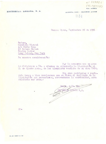 [Carta] 1956 sep. 26, Buenos Aires, [Argentina] [a] Gabriela Mistral, Roslyn Harbor, New York, (U.S.A.) [manuscrito] Editorial Losada S.A. (Argentina).