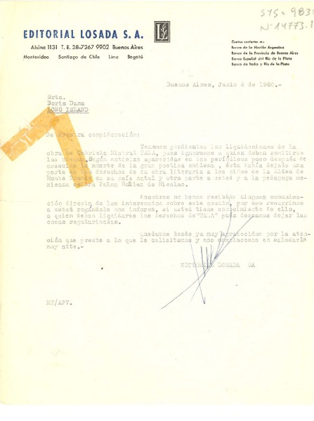 [Carta] 1960 jun. 8, Buenos Aires, [Argentina] [a] Doris Dana, Roslyn Harbor, New York, (U.S.A.) [manuscrito] Editorial Losada S.A. (Argentina).