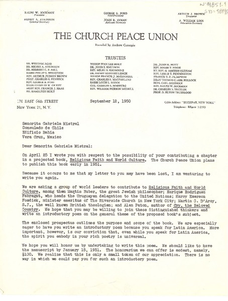 [Carta] 1950 sep. 12, New York, [Estados Unidos] [a] Gabriela Mistral, Veracruz, México [manuscrito] A. Williams Loos.