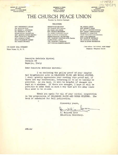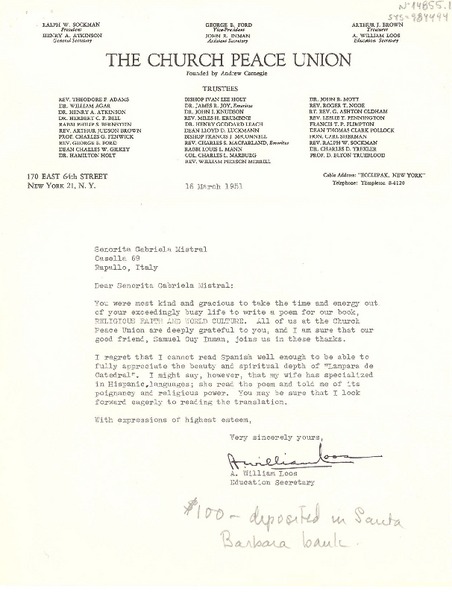 [Carta] 1951 mar. 16, New York, [Estados Unidos] [a] Gabriela Mistral, Rapallo, Italia [manuscrito] A. William Loos.
