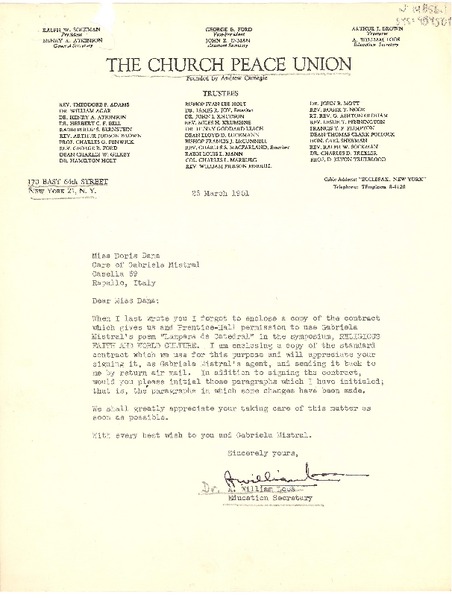 [Carta] 1951 mar. 16, New York, [Estados Unidos] [a] Doris Dana care of Gabriela Mistral, Rapallo, Italia [manuscrito] A. William Loos.