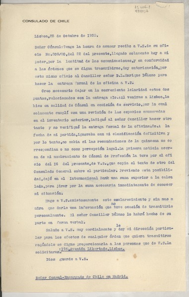 [Oficio] 1935 oct. 25, Lisboa, [Portugal] [al] Señor Cónsul-Encargado de Chile en Madrid, [España] [manuscrito] [Gabriela Mistral].