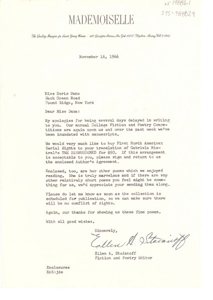 [Carta] 1966 nov. 16, New York, [Estados Unidos] [a] Doris Dana, New York, [Estados Unidos] [manuscrito] Ellen A. Stoianoff.