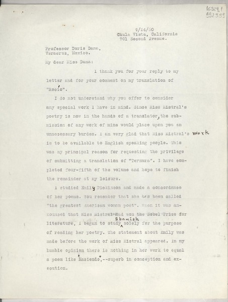 [Carta] 1950 ago. 11, Chula Vista, California, [Estados Unidos] [a] Gabriela Mistral, Xalapa, México [manuscrito] Frank Harley Lane.
