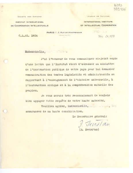 [Carta] 1934 nov. 20, Paris, [Francia] [a] Mademoiselle [manuscrito] D. Secrétan, Le Secrétaire général.