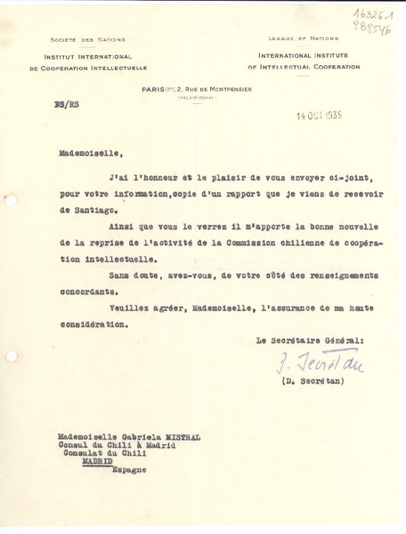 [Carta] 1935 oct. 14, Paris, 2 Rue de Montpensier, [France] [a la] Mademoiselle Gabriela Mistral, Consul du Chili à Madrid, Consulat du Chili, Madrid, Espagne [manuscrito] D. Secrétan, Le Secrétaire général.