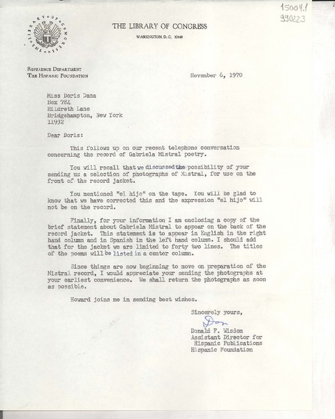 [Carta] 1970 Dec. 7, [Washington D. C., Estados Unidos] [a] Miss Doris Dana, Box 784, Hildreth Lane, Bridgehampton, New York [manuscrito] Donald F. Wisdom.