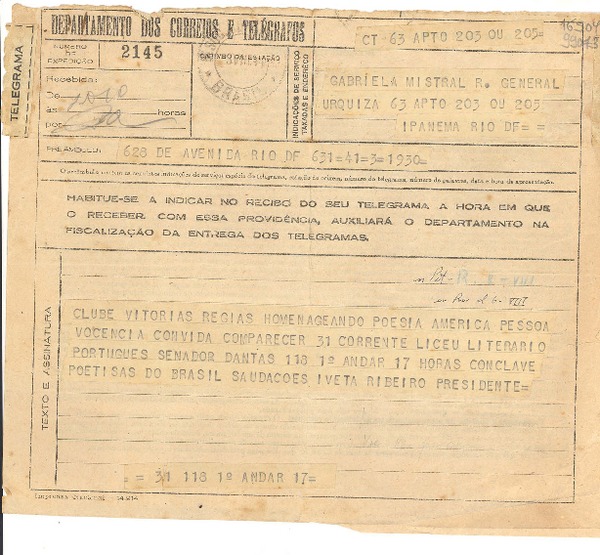 [Telegrama] 1944 agosto 10, Rio de Janeiro, [Brasil] [a] Gabriela Mistral, General Urquiza 63, Apto. 203, Leblon, Rio [manuscrito] Iveta Ribeiro.