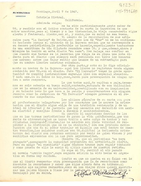 [Carta] 1947 abr. 7, Santiago, [Chile] [a] Gabriela Mistral, California, [Estados Unidos] [manuscrito] Rafael Maluenda.
