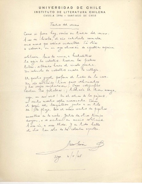 Tardes de verano [manuscrito] Alfonso Calderón.