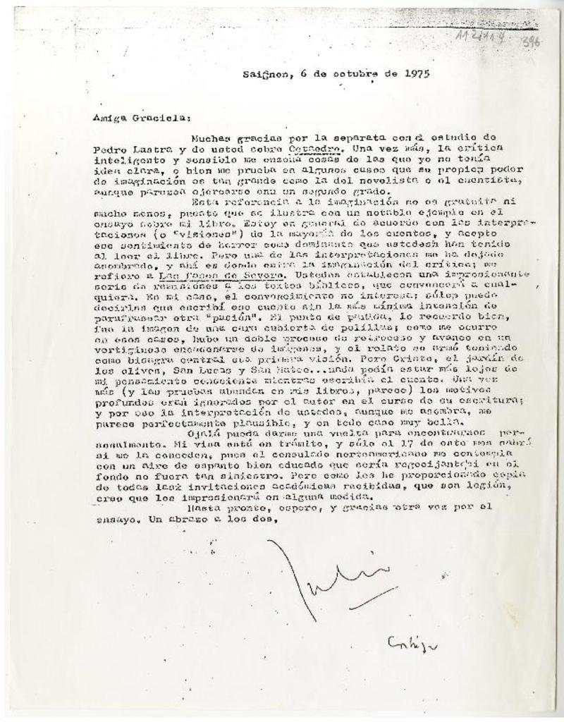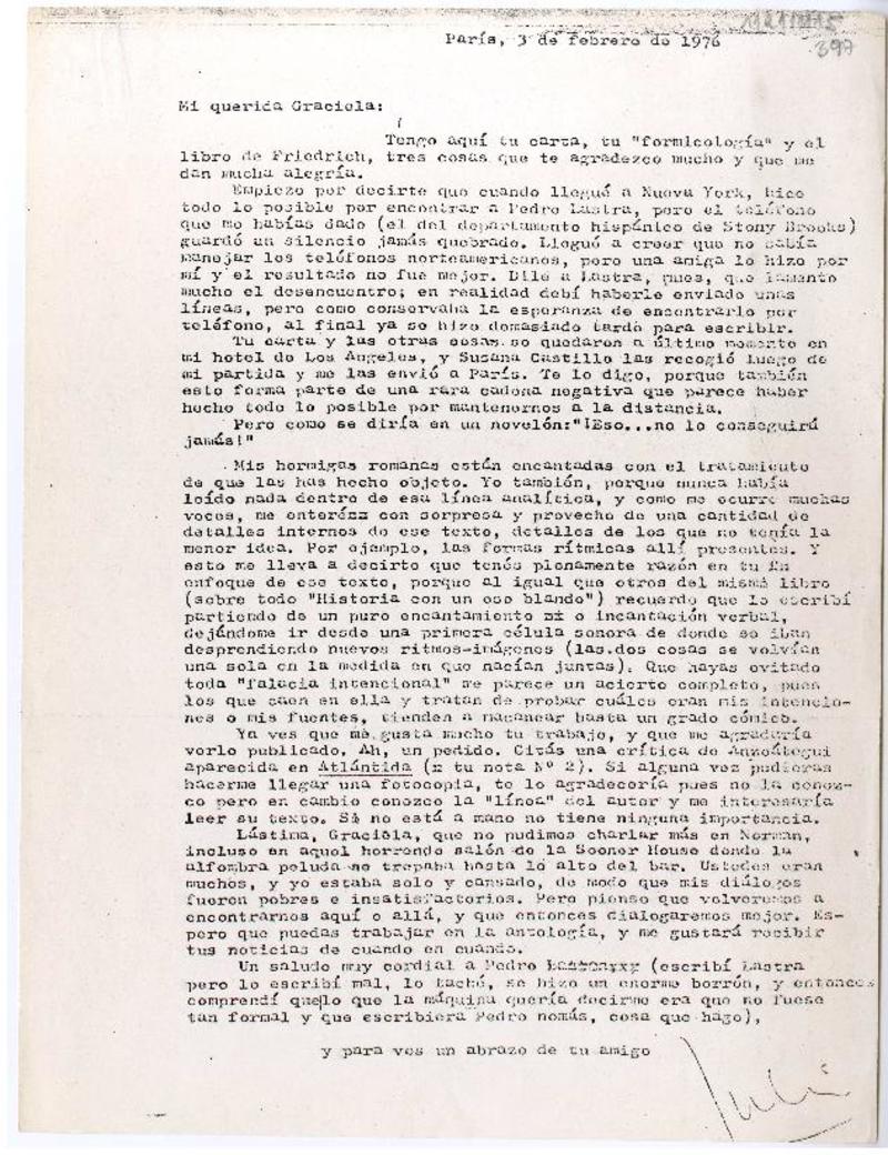 Paris, Francia [a] Graciela Carta, 6 de octubre 1976, [manuscrito] Julio Cortázar.