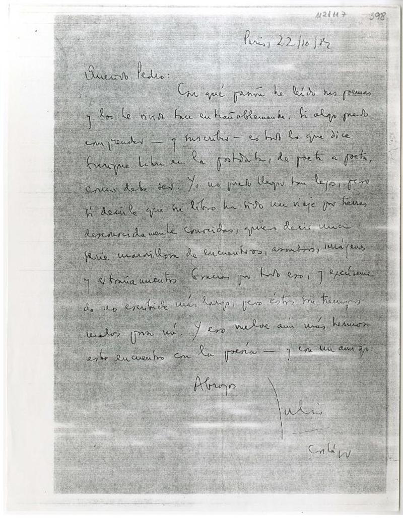 Paris, Francia [a] Pedro Lastra Carta, 22 de octubre 1982, [manuscrito] Julio Cortázar.
