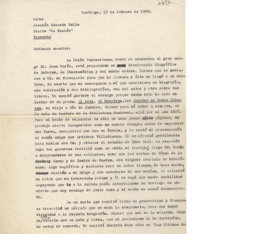 [Carta] 1958 febrero 17, Santiago [Chile] [a] Joaquín Edwards Bello [manuscrito] Luis Merino Reyes.