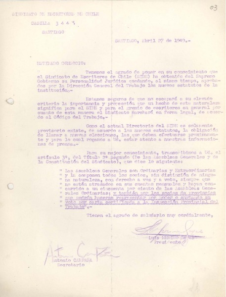 [Carta] 1949 abr. 27, Santiago, Chile [a] [Socios Sindicato de Escritores de Chile] [manuscrito] Luis Merino Reyes.