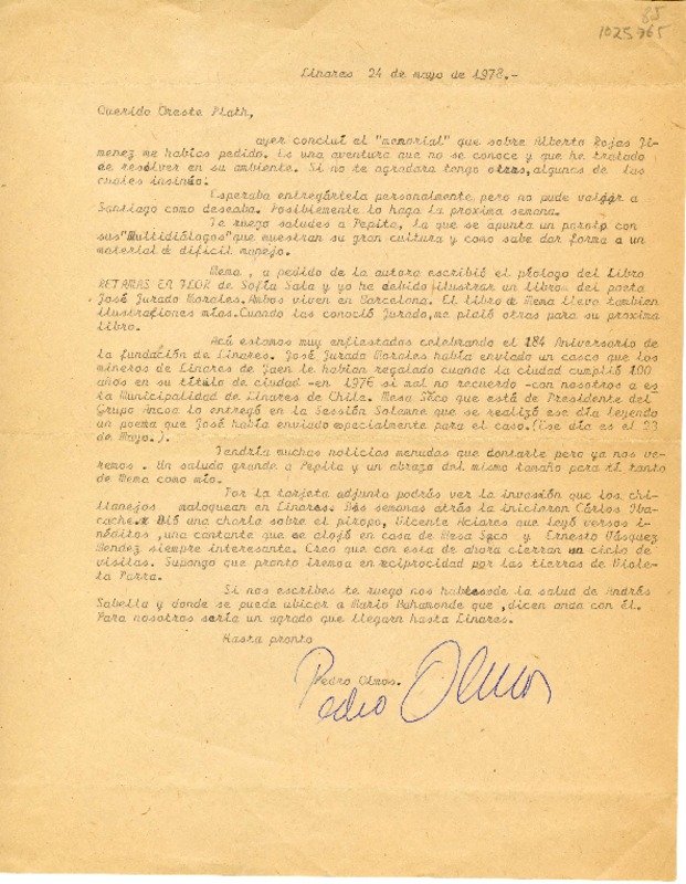 [Carta] 1978 mayo 24, Linares, Chile [a] Oreste Plath [manuscrito] Pedro Olmos.