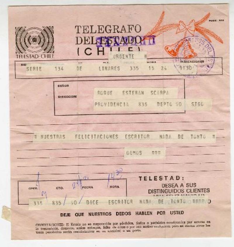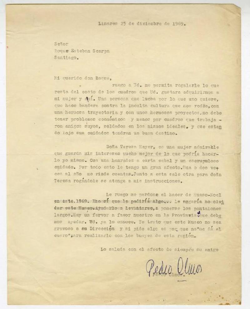 Linares, Chile [a] Roque Esteban Scarpa carta, 1969 diciembre 25, [manuscrito] Pedro Olmos.