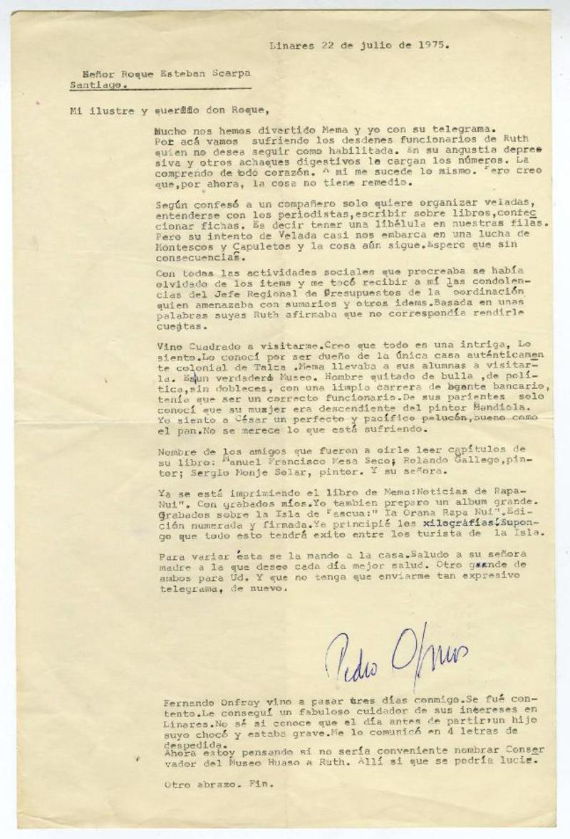 Linares, Chile [a] Roque Esteban Scarpa carta, 1975 julio 22, [manuscrito] Pedro Olmos.