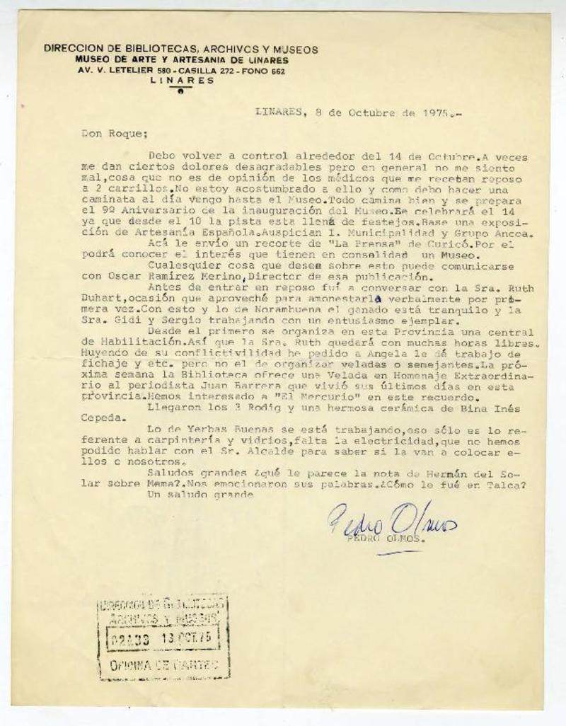 Linares, Chile [a] Roque Esteban Scarpa Carta, 1975 octubre 8, [manuscrito] Pedro Olmos.