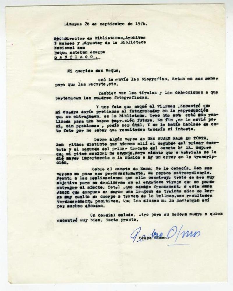 Linares, Chile [a] Roque Esteban Scarpa Carta, 1976 septiembre 26, [manuscrito] Pedro Olmos.
