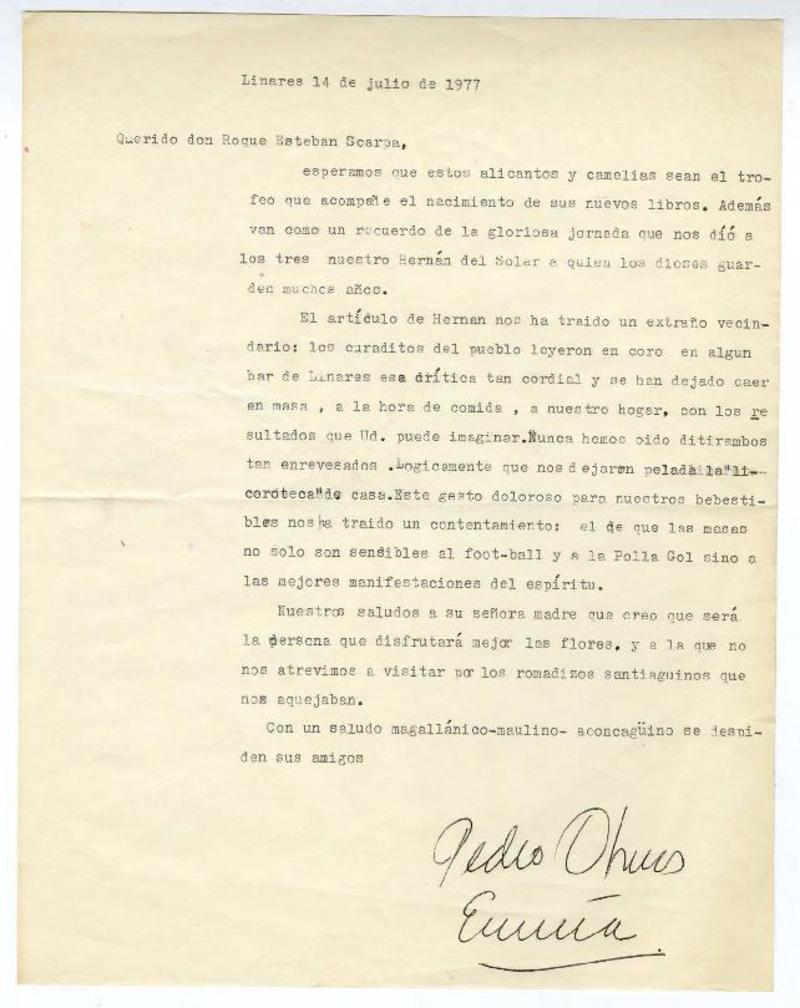 Linares, Chile [a] Roque Esteban Scarpa Carta, 1977 julio 14, [manuscrito] Pedro Olmos.