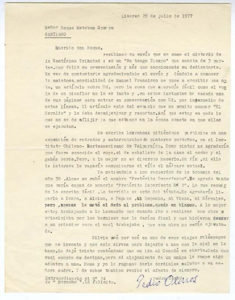 Linares, Chile [a] Roque Esteban Scarpa Carta, 1977 julio 29, [manuscrito] Pedro Olmos.
