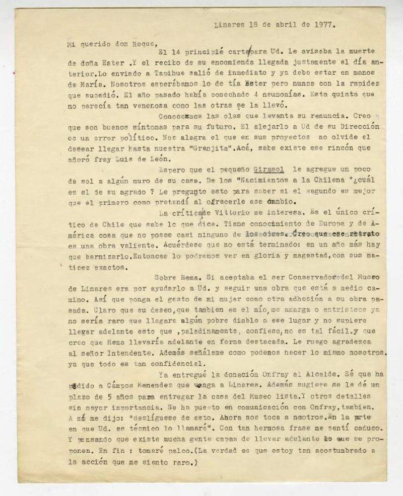 Linares, Chile [a] Roque Esteban Scarpa Carta, 1977 abril 18, [manuscrito] Pedro Olmos.