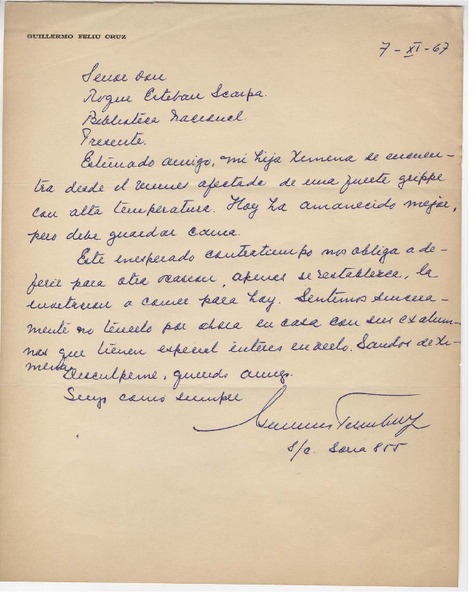 [Carta] 1967 nov. 7, Santiago, Chile [a] Roque Esteban Scarpa [manuscrito] Guillermo Feliú Cruz.