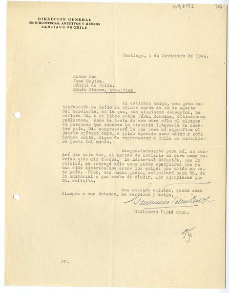 [Carta] 1946 noviembre 2, Santiago, Chile [a] Juan Mujica de la Fuente, Bahía Blanca, Argentina [manuscrito] Guillermo Feliú Cruz.