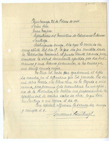 [Carta] 1944 febrero 26, Chimbarongo, Chile [a] Juan Mujica de la Fuente, Santiago [manuscrito] Guillermo Feliú Cruz.