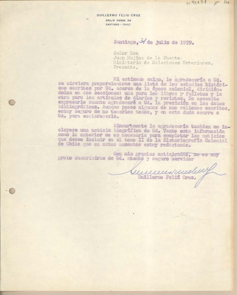 [Carta] 1959 noviembre 5, Santiago, Chile [a] Juan Mujica de la Fuente [manuscrito] Guillermo Feliú Cruz.