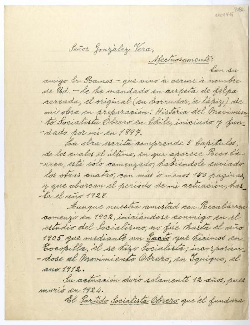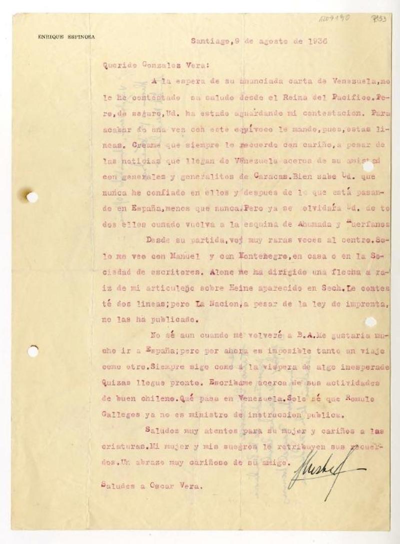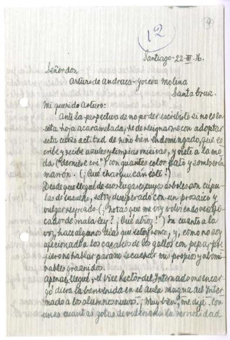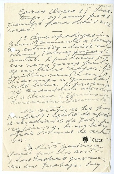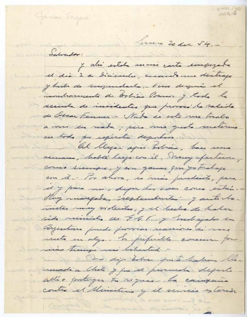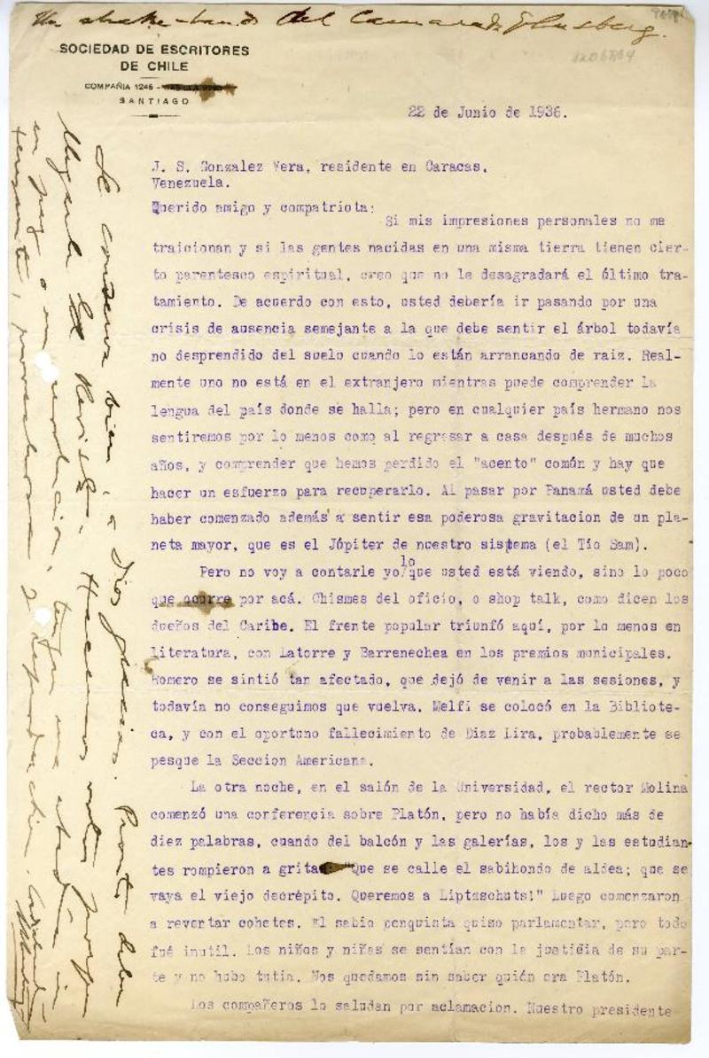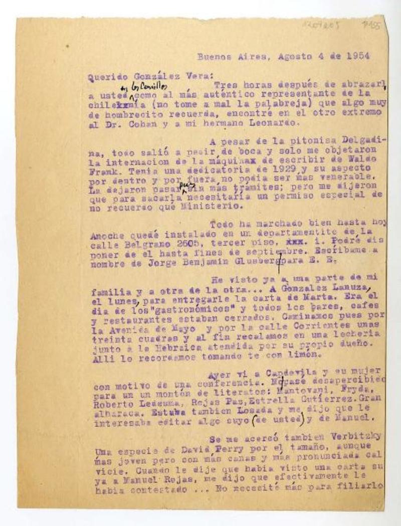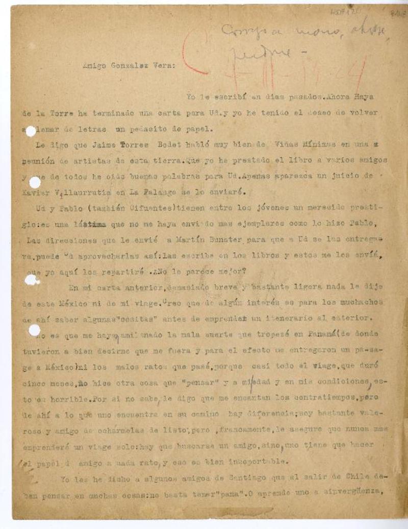 Valparaíso, La Serena y Buenos Aires [a] José Santos González Vera Cartas, Entre 1935 y 1938, [manuscrito] Ernesto Montenegro.