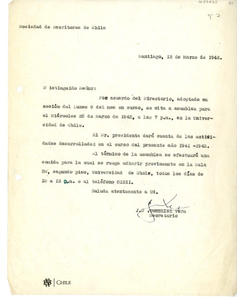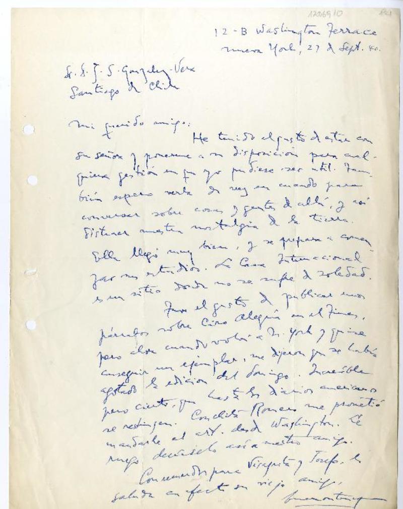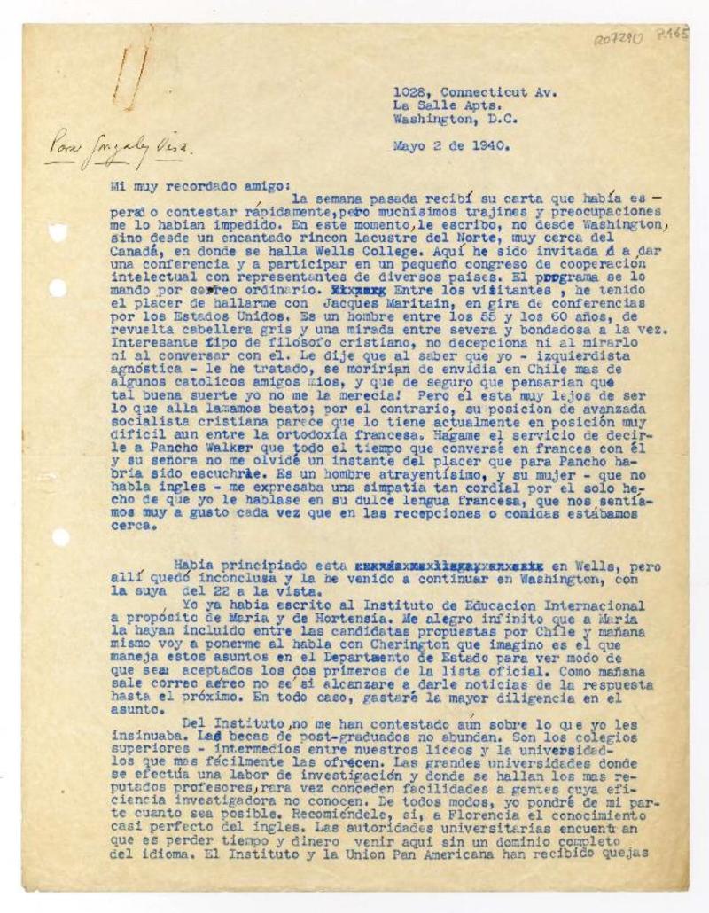 Washington y Montevideo [a] José Santos González Vera Cartas, 2 de mayo de 1940 y 6 de noviembre de 1942, [manuscrito] Amanda Labarca.