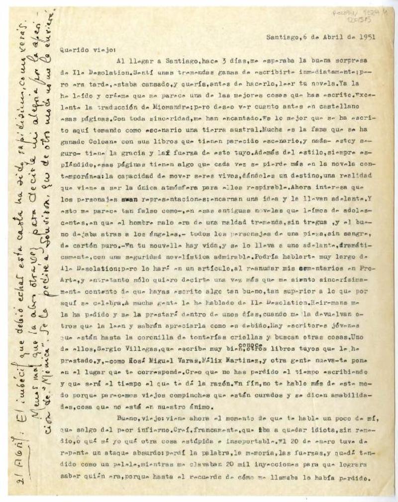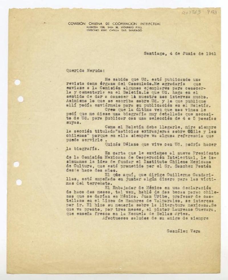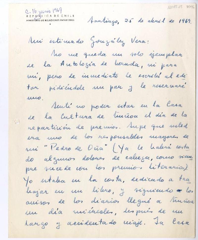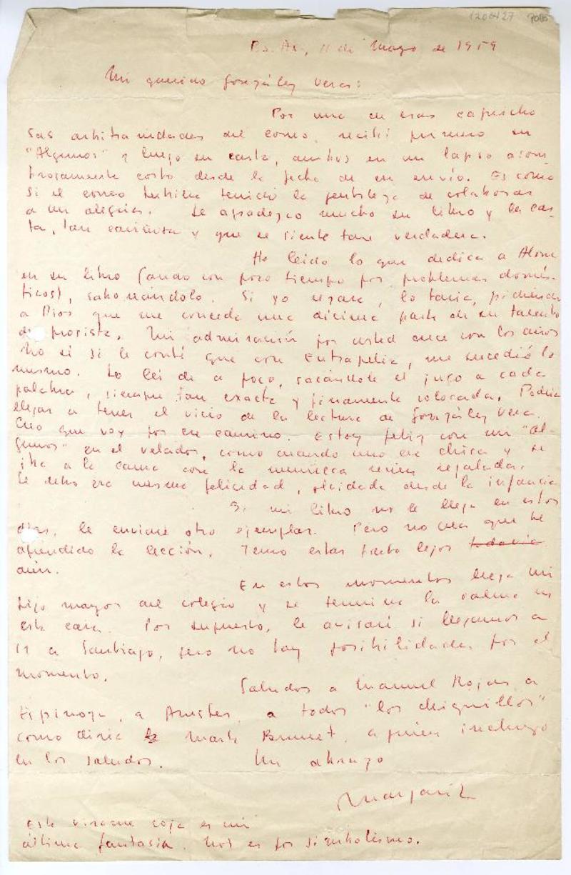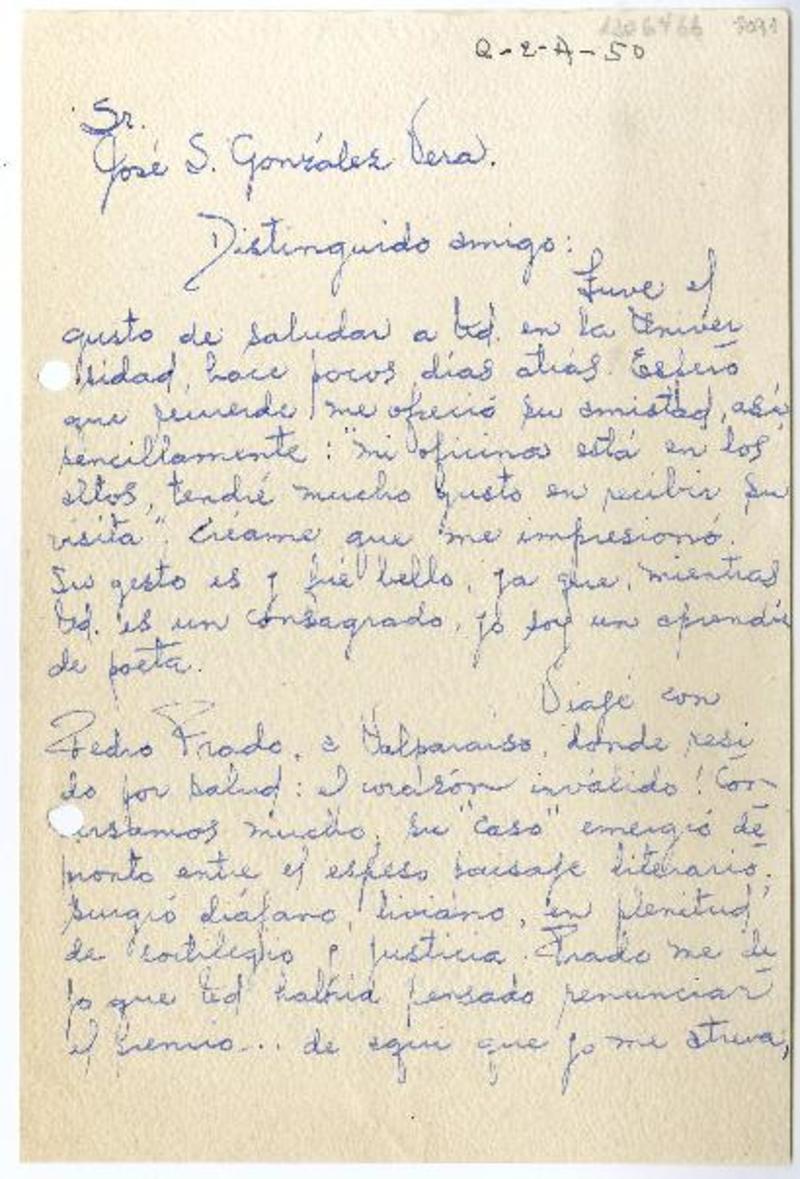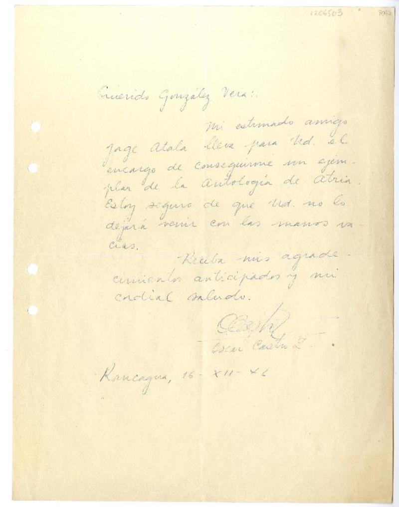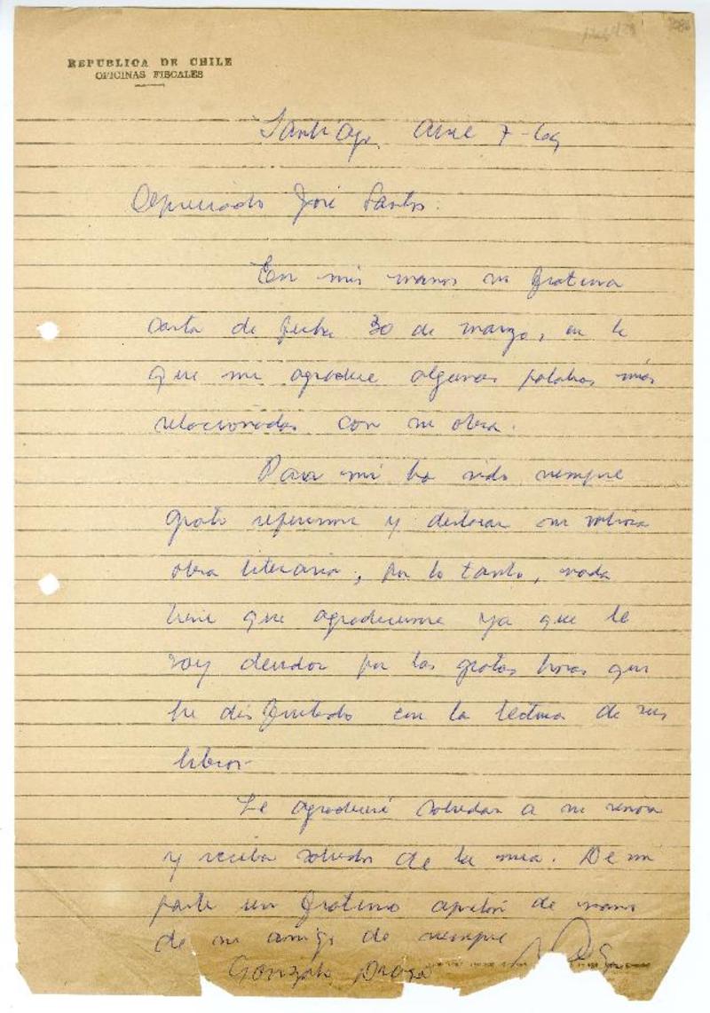Antofagasta, Chile [a] José Santos González Vera Carta, 1941 abril 6, [manuscrito] Ciro Alegría.