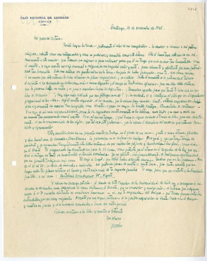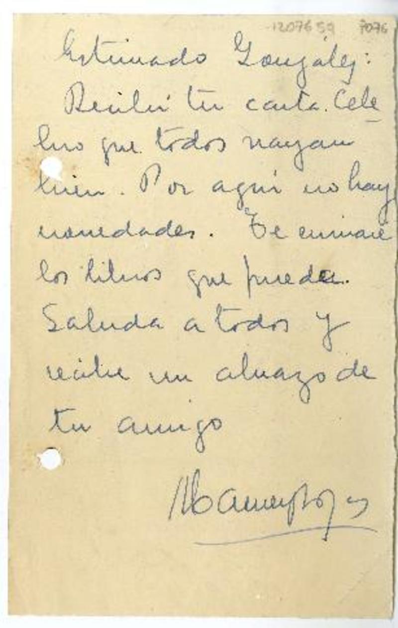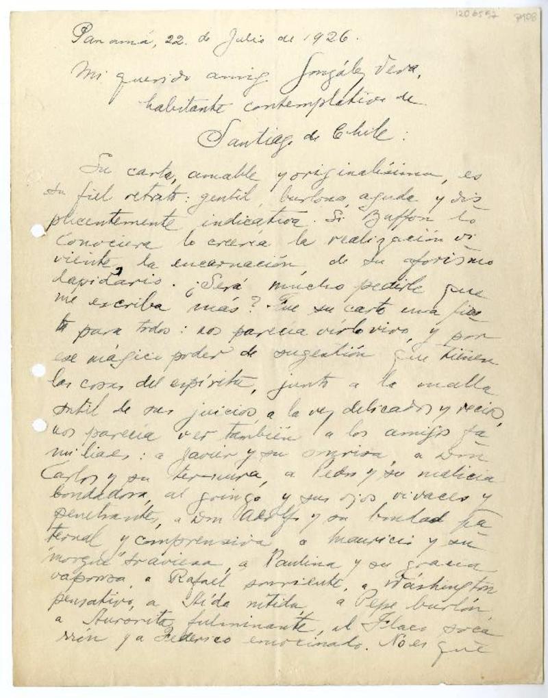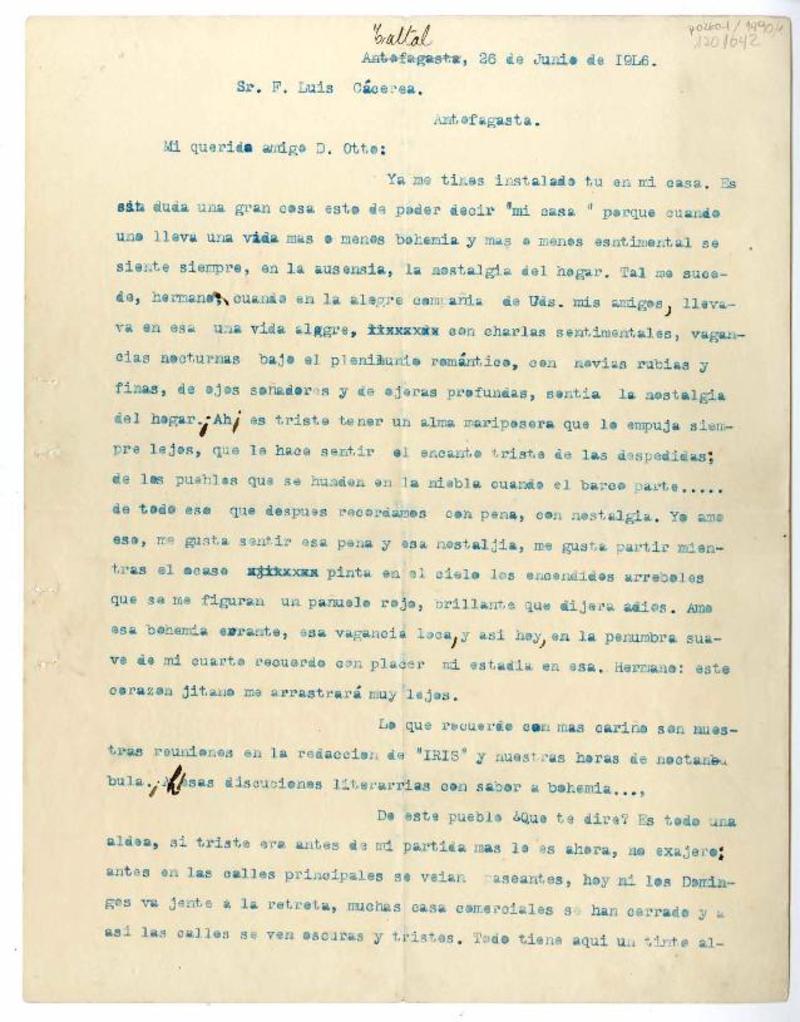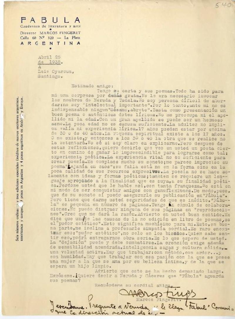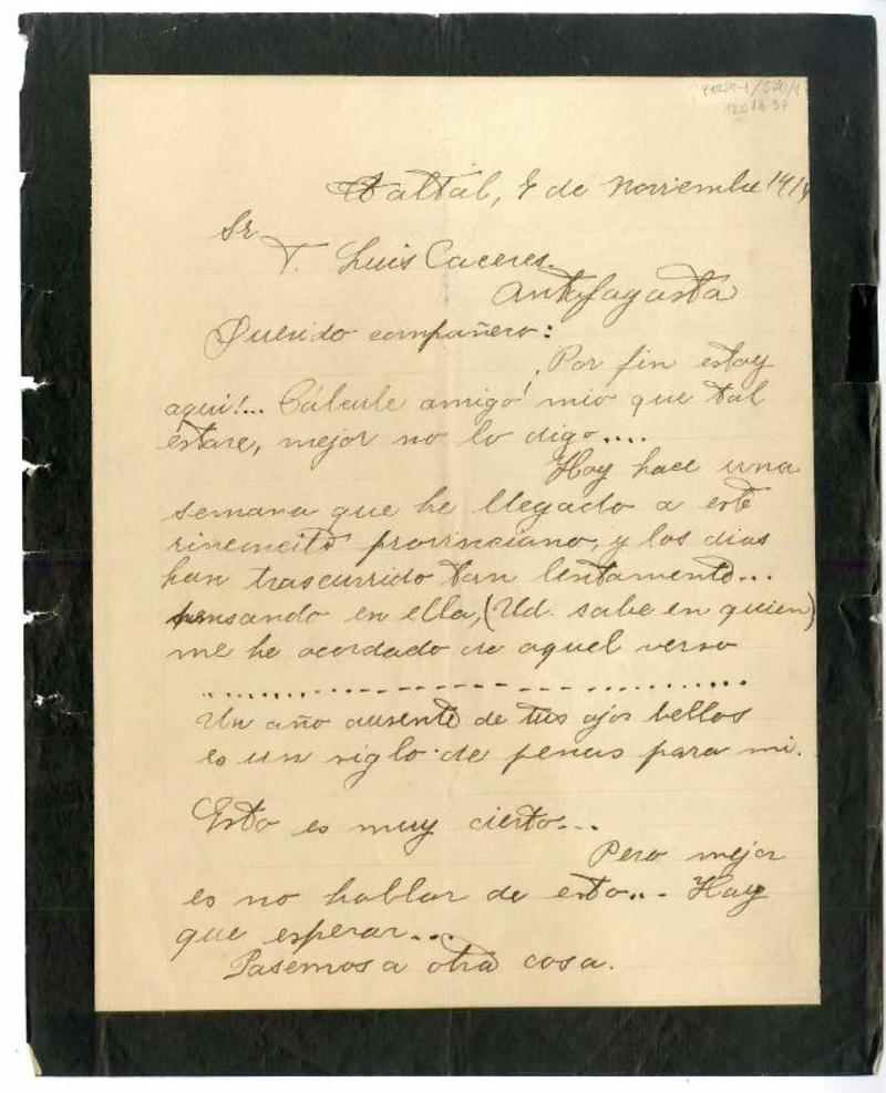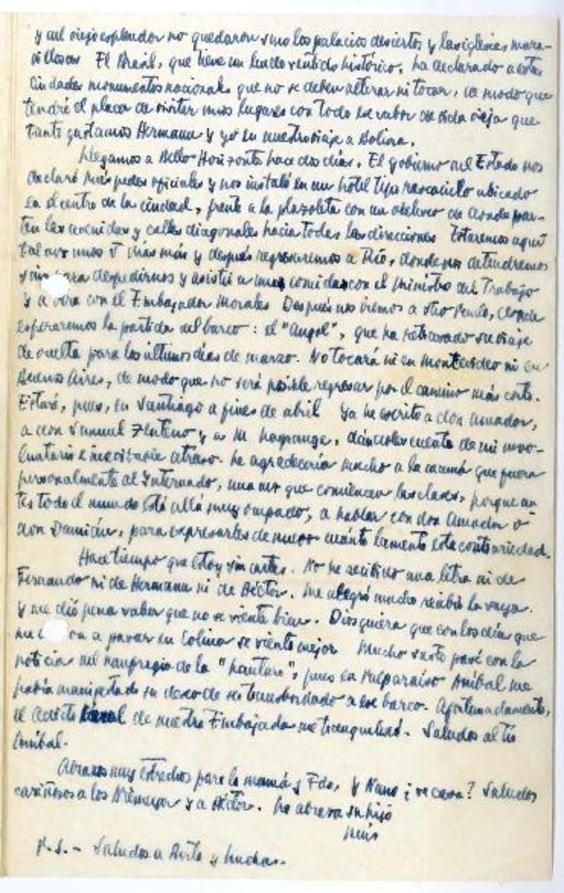 Antofagasta, Chile [a] José Santos González Vera Carta, 1941 abril 6, [manuscrito] Ciro Alegría.