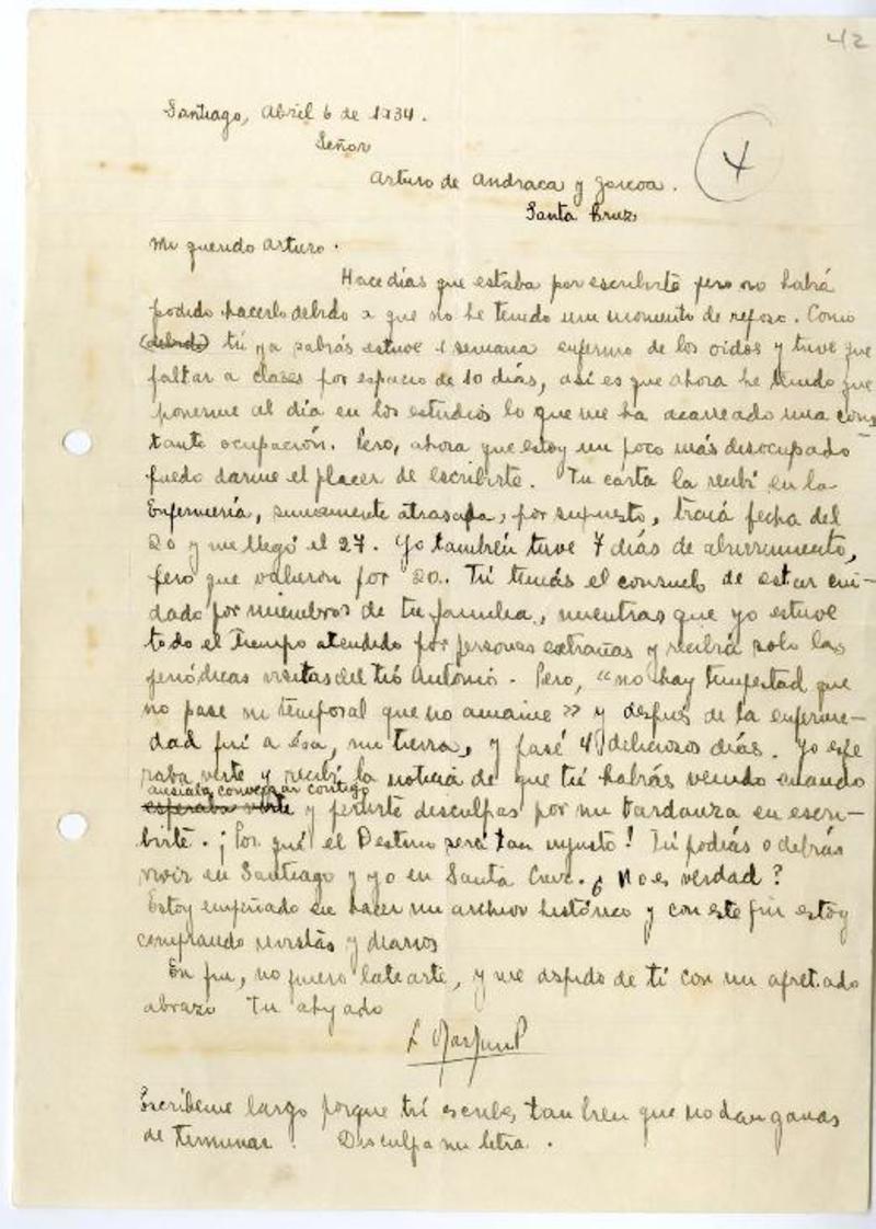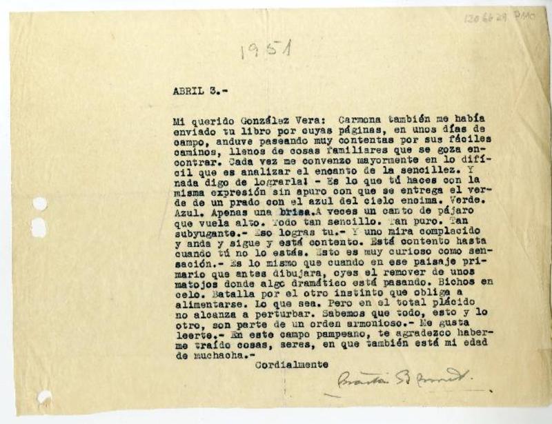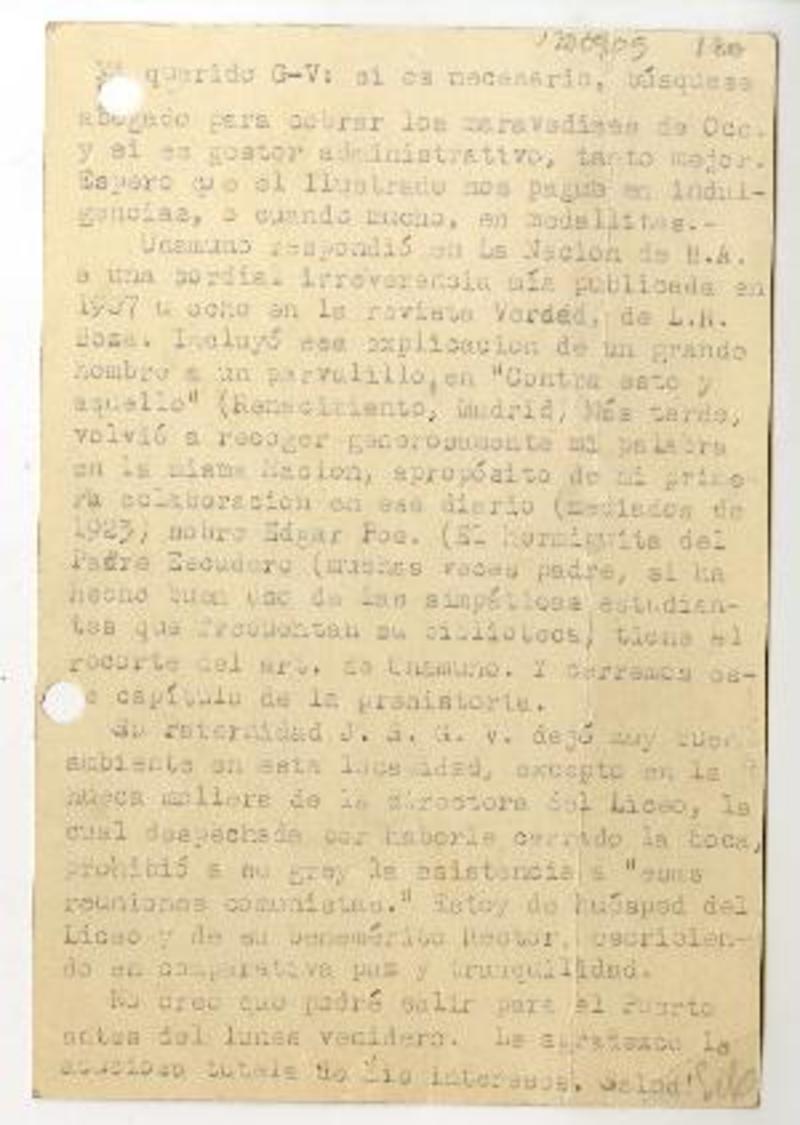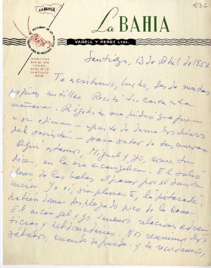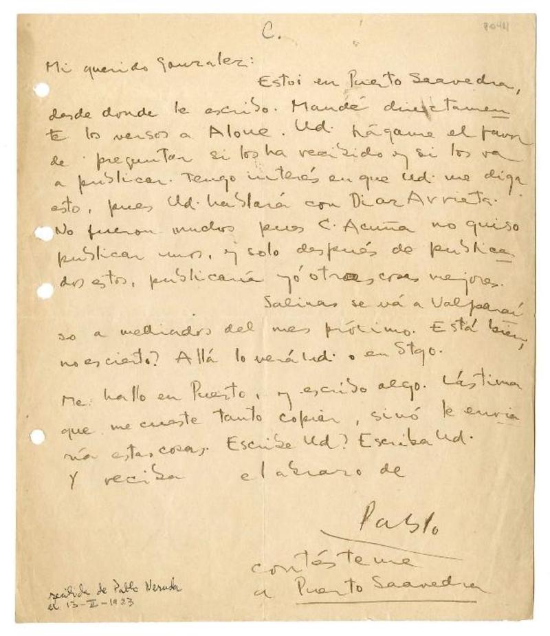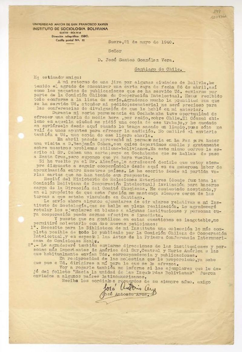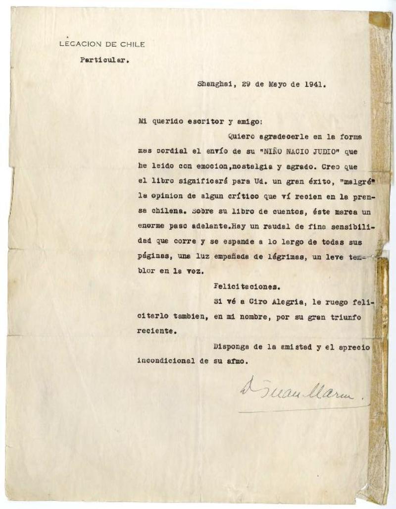 Antofagasta, Chile [a] José Santos González Vera Carta, 1941 abril 6, [manuscrito] Ciro Alegría.