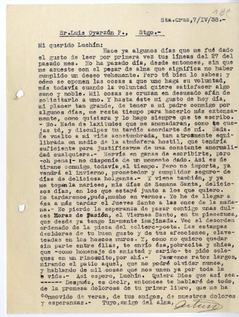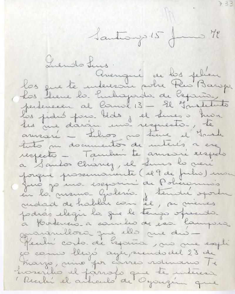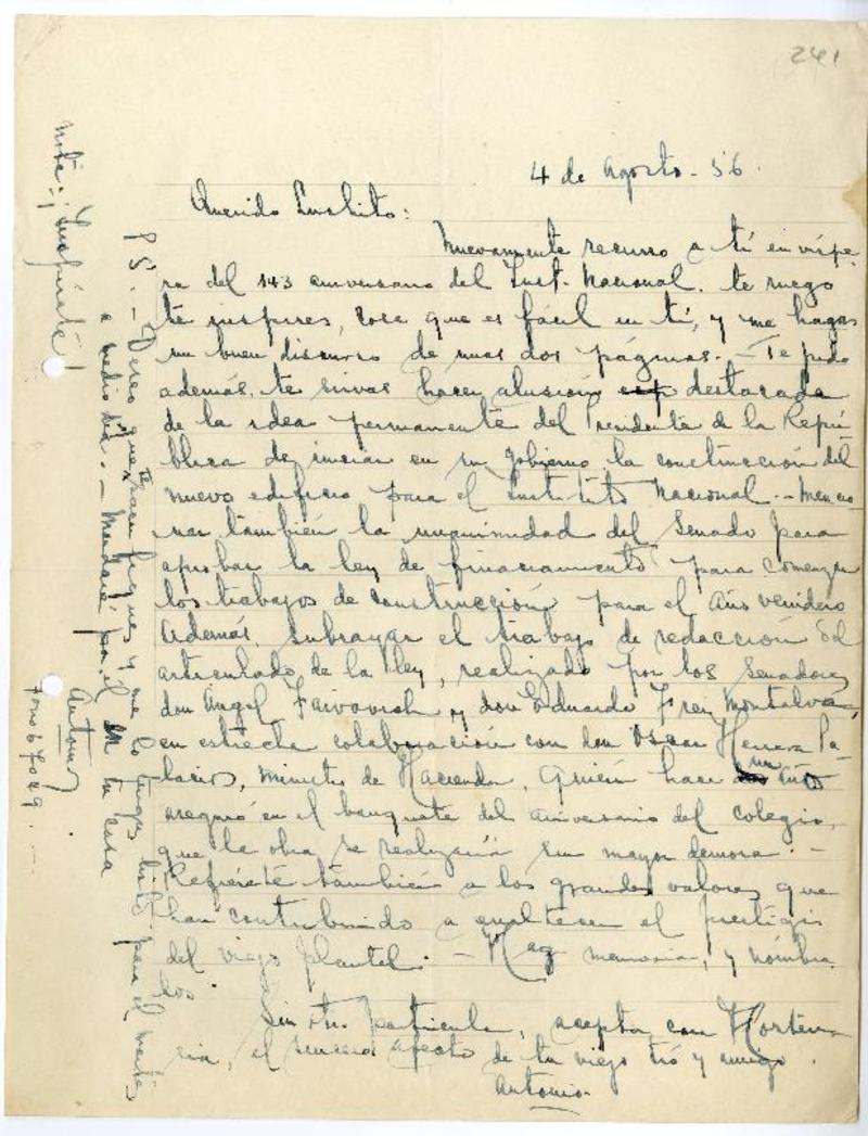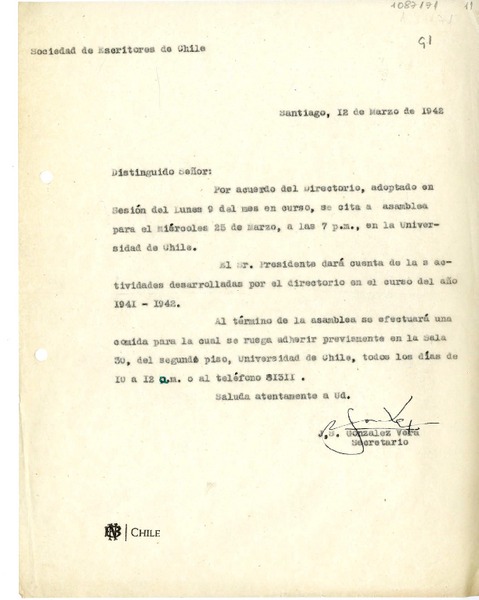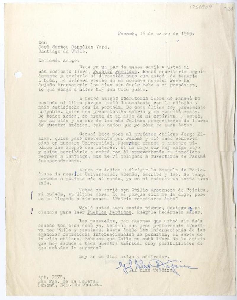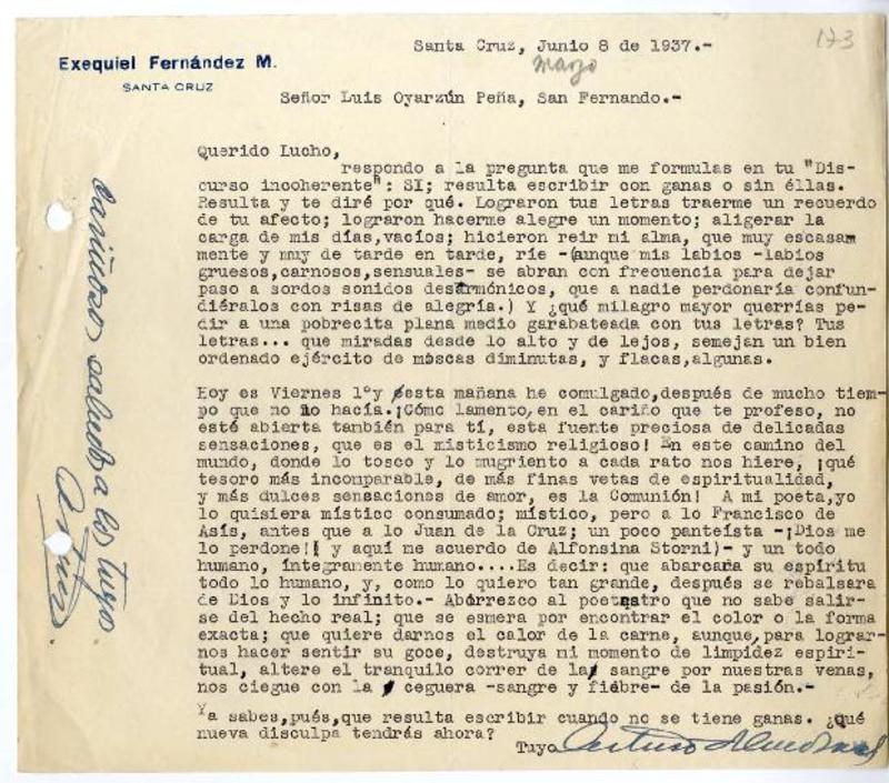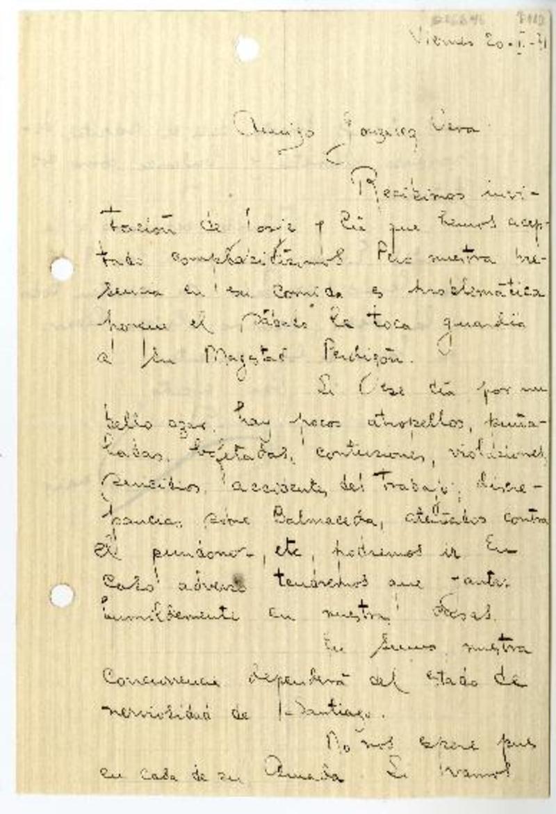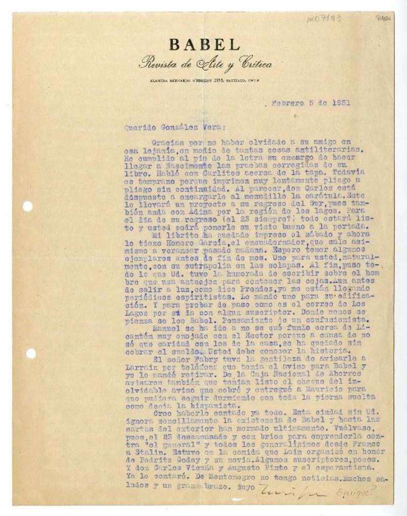 Antofagasta, Chile [a] José Santos González Vera Carta, 1941 abril 6, [manuscrito] Ciro Alegría.