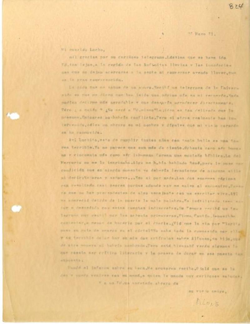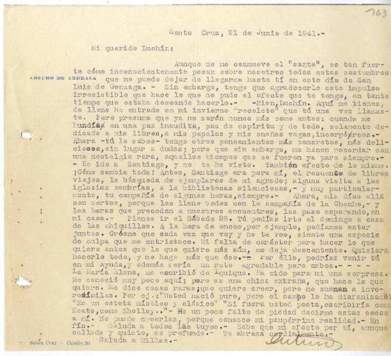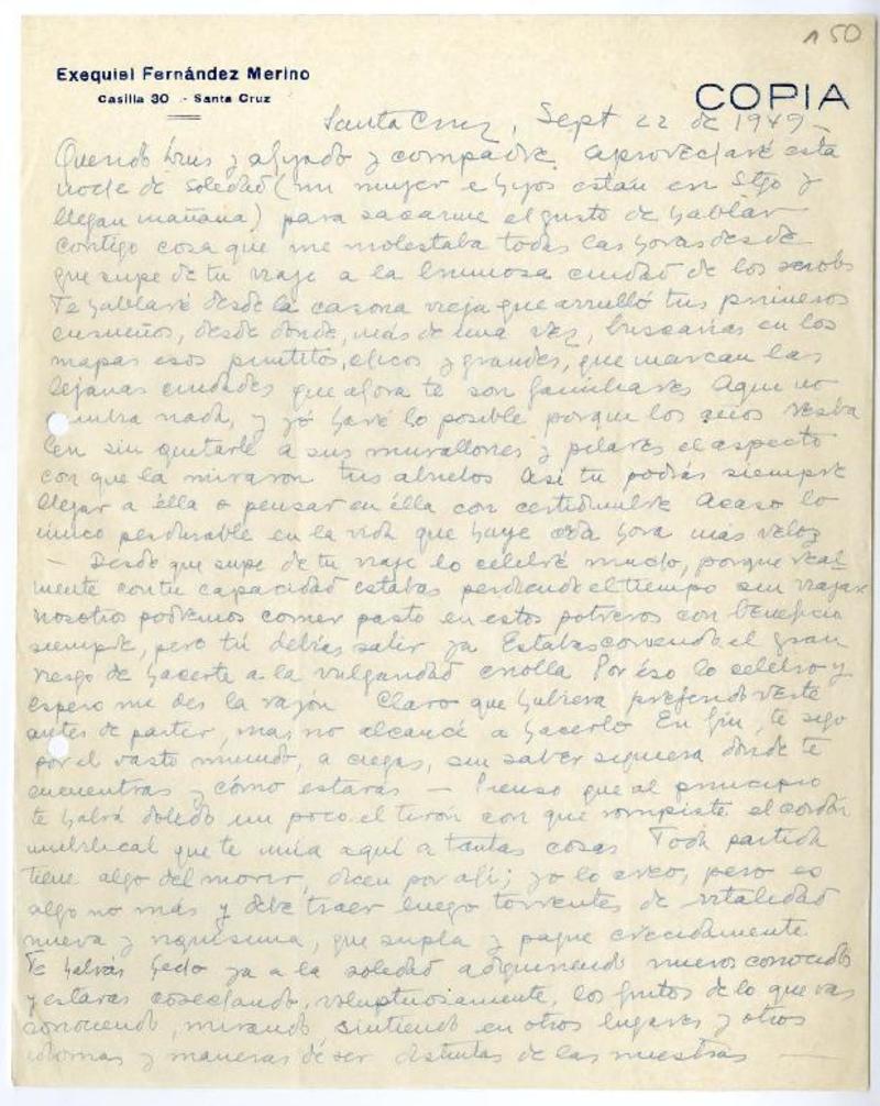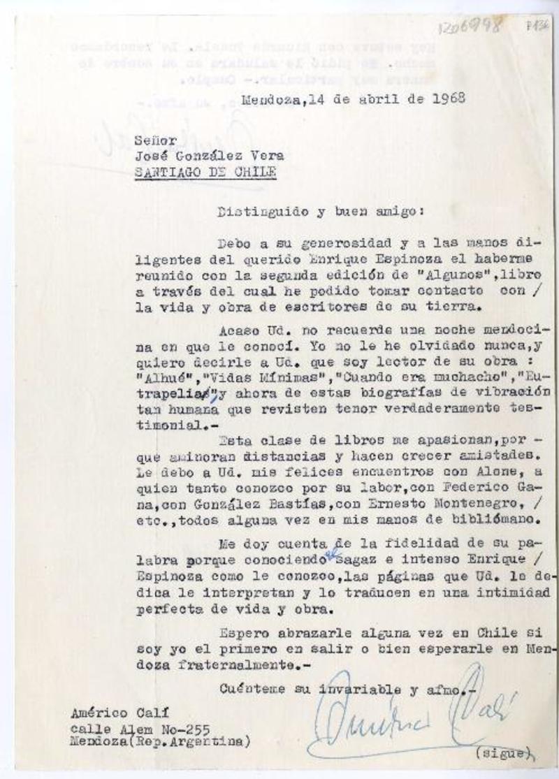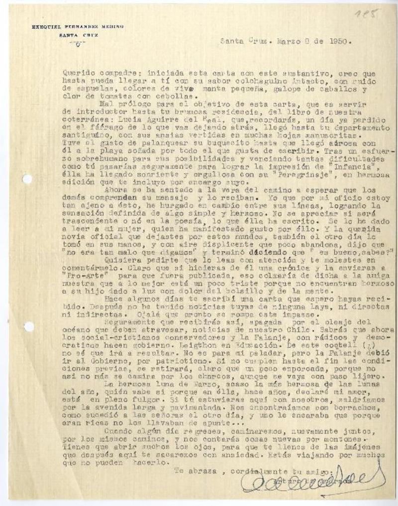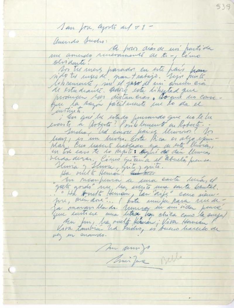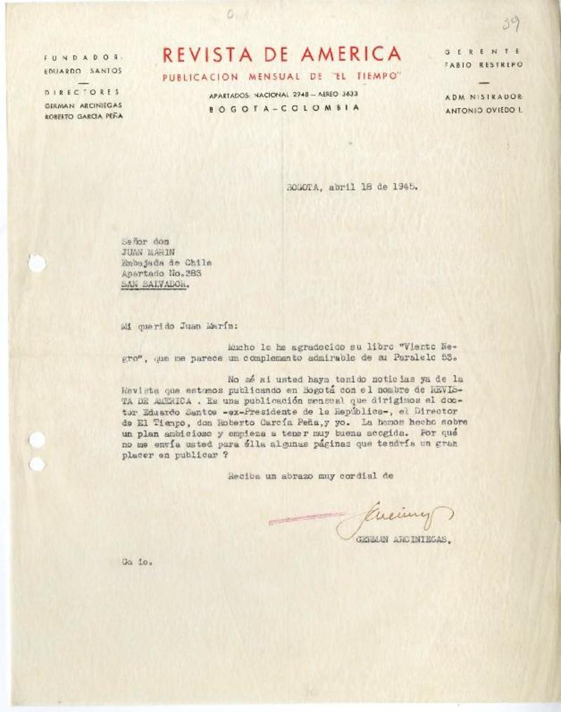 Antofagasta, Chile [a] José Santos González Vera Carta, 1941 abril 6, [manuscrito] Ciro Alegría.
