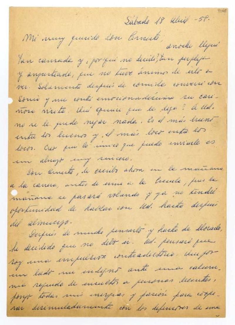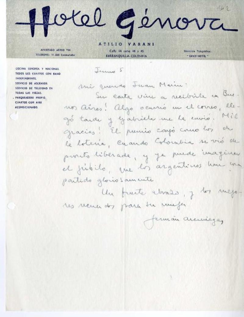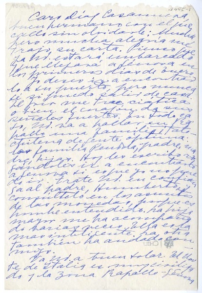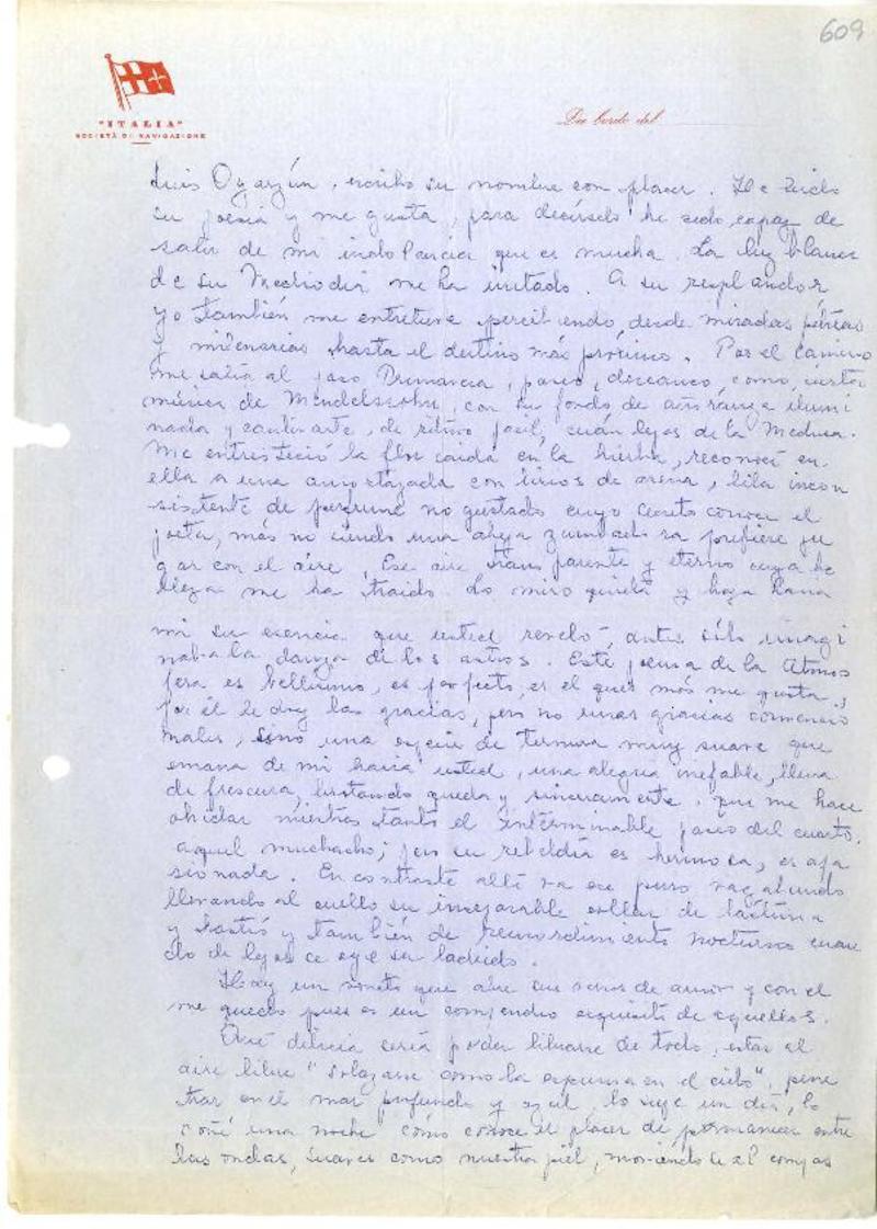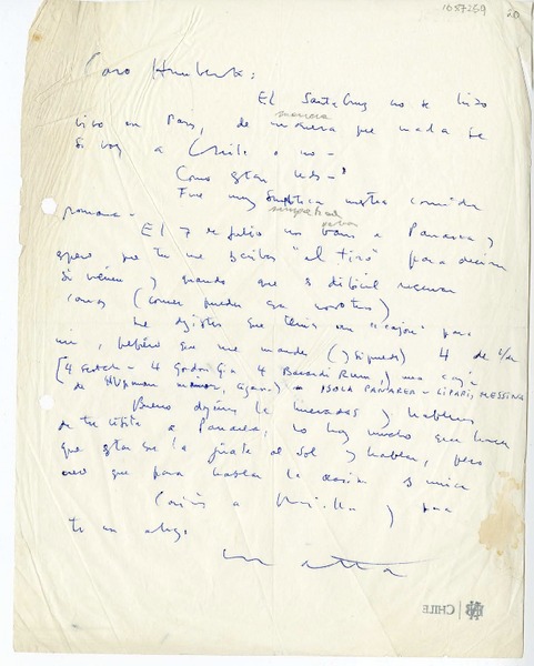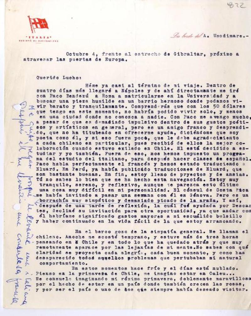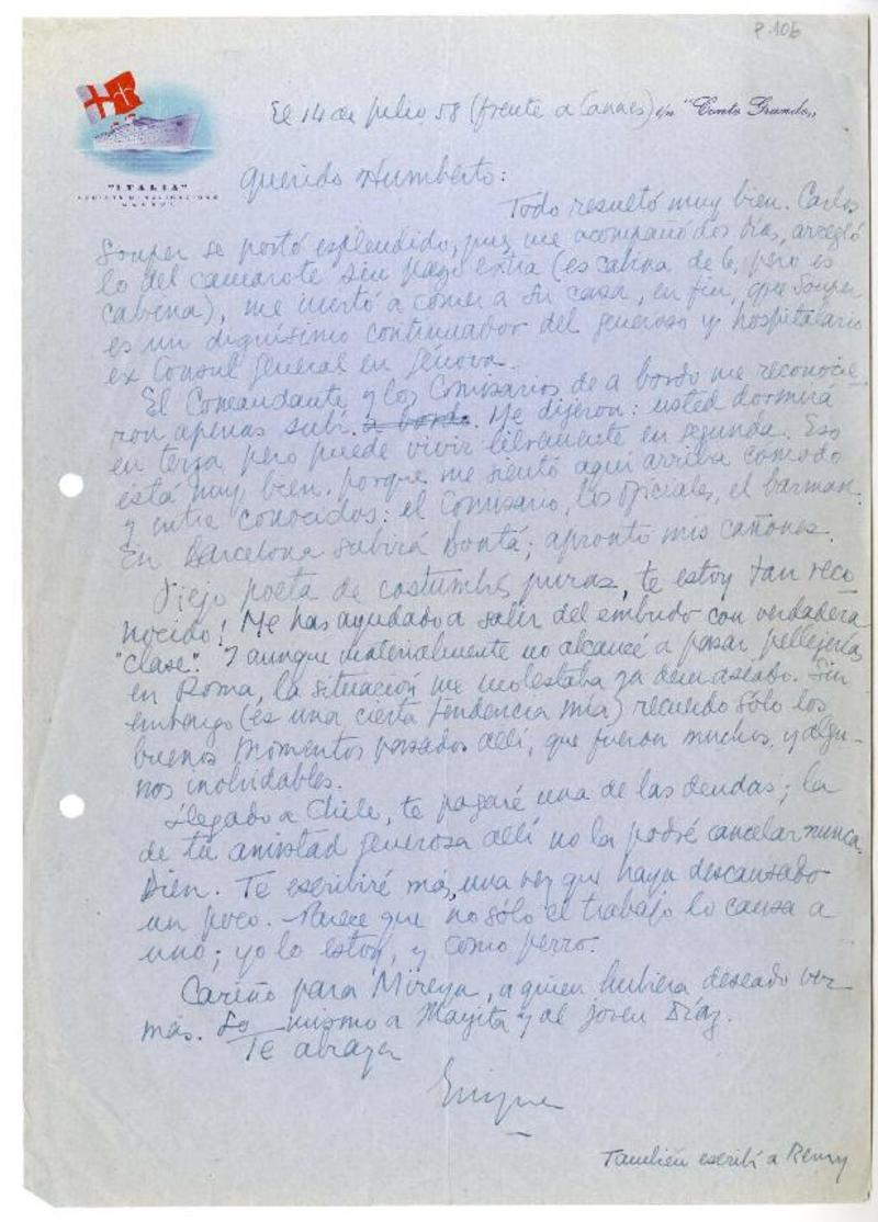 A bordo del vapor "Italia" [a] Humberto Díaz-Casanueva Carta, 1958 julio 14, [manuscrito] Enrique Bello.