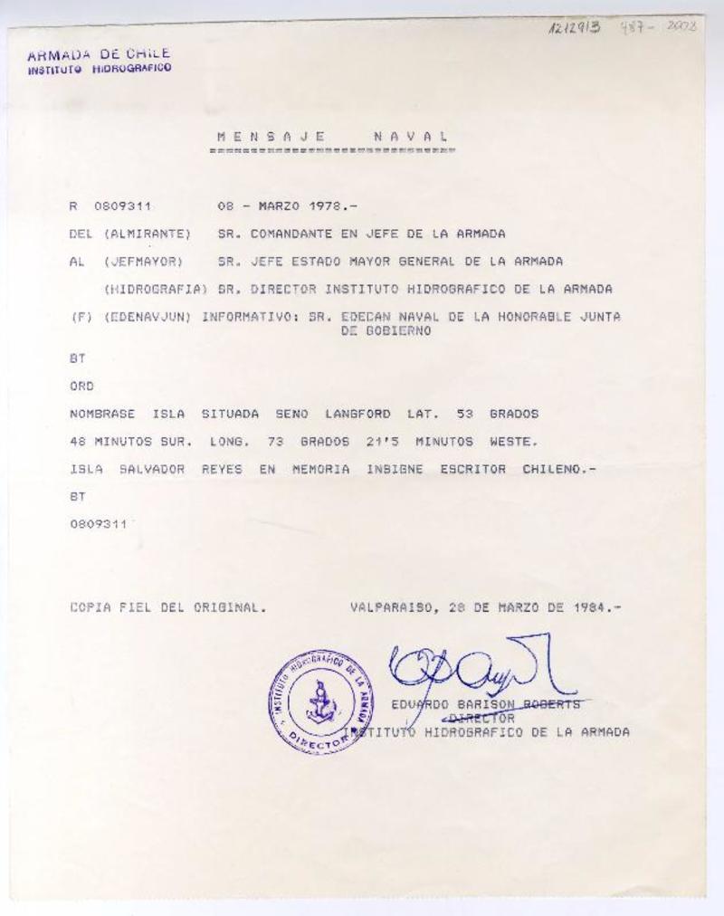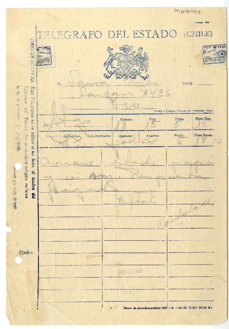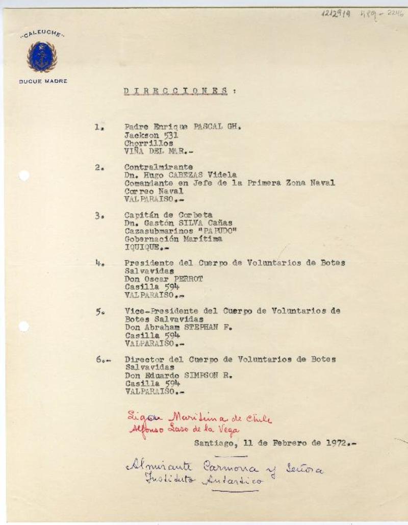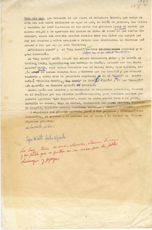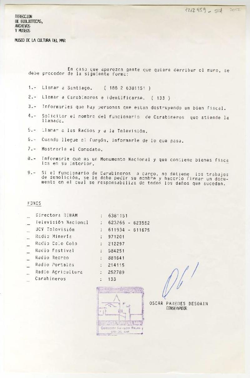 Viña del Mar, Chile [a] Funcionarios Comunicado, cerca de 1994, [manuscrito] Museo de la Cultura y el Mar (Valparaíso, Chile).