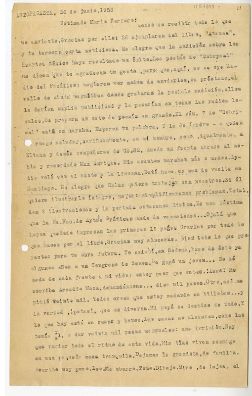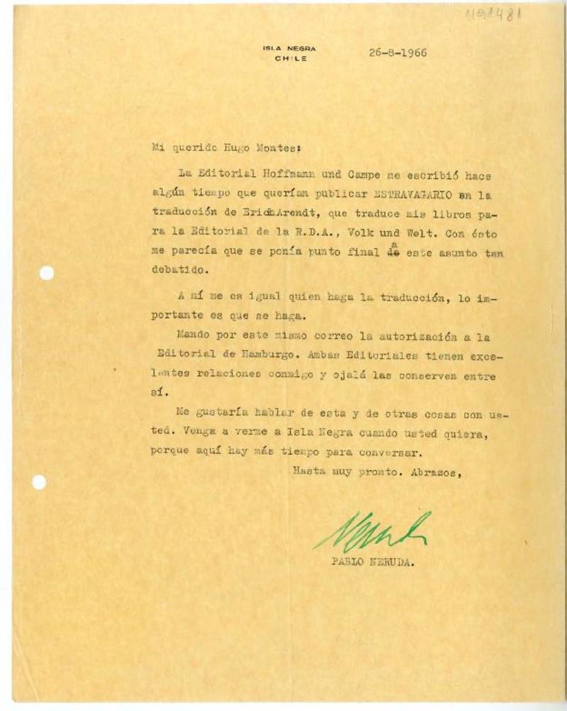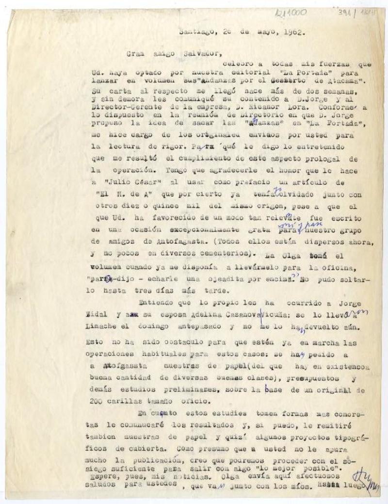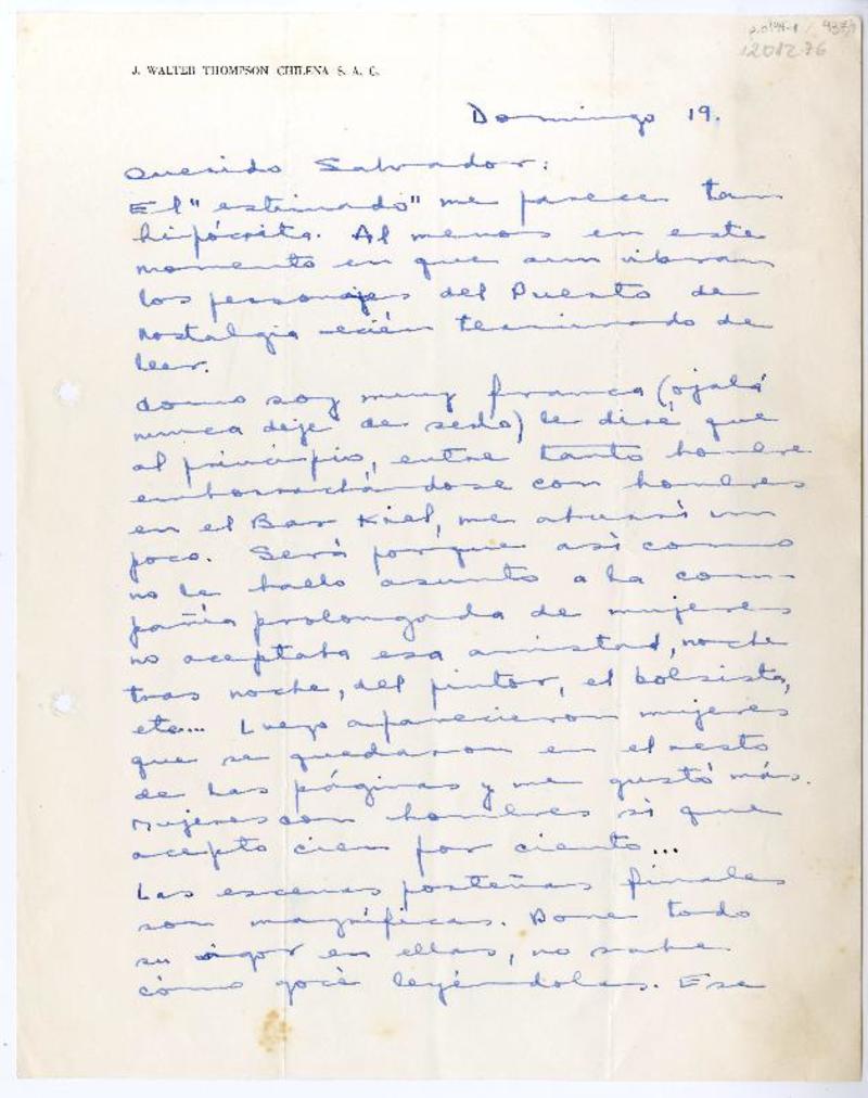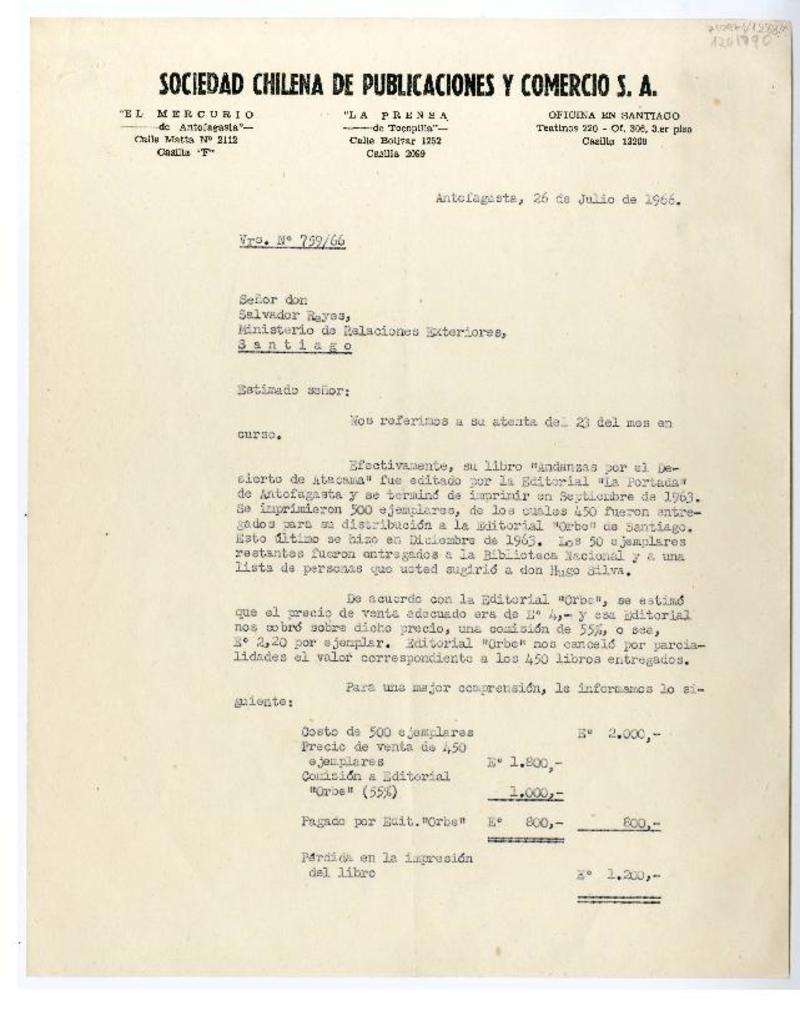 Antofagasta, Chile [a] Salvador Reyes, Santiago Carta, 1966 julio 26, [manuscrito] Sociedad Chilena de Publicaciones y Comercio S.A.