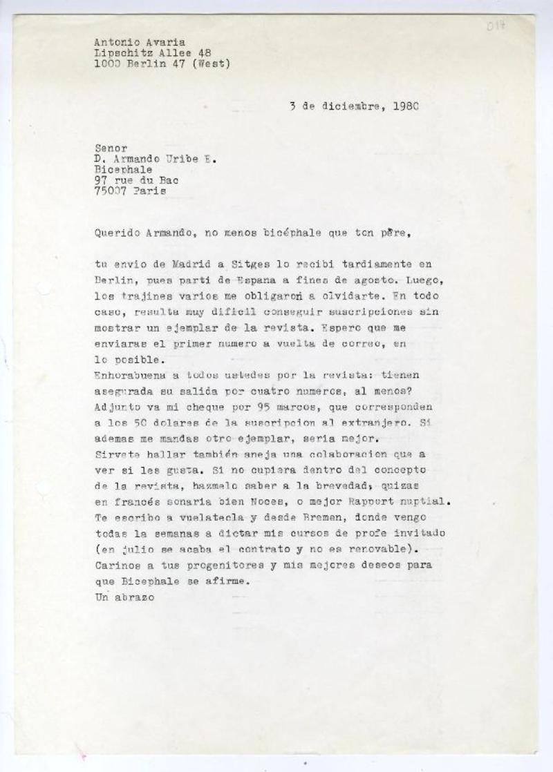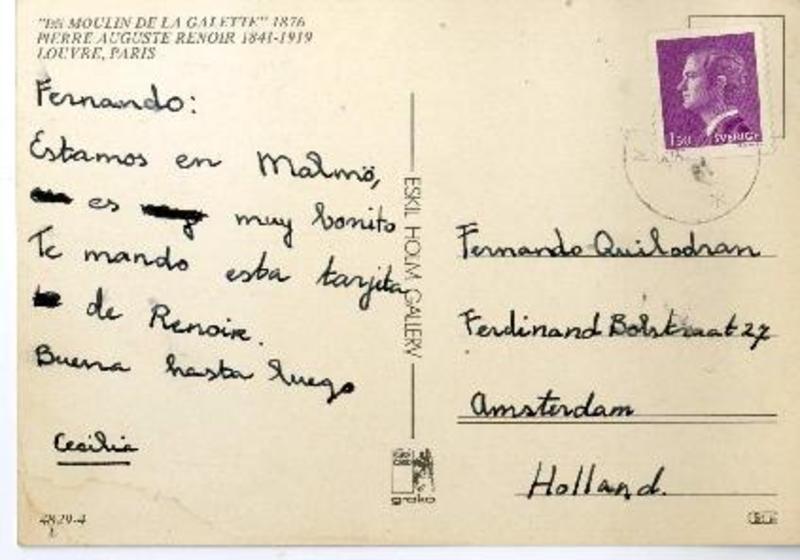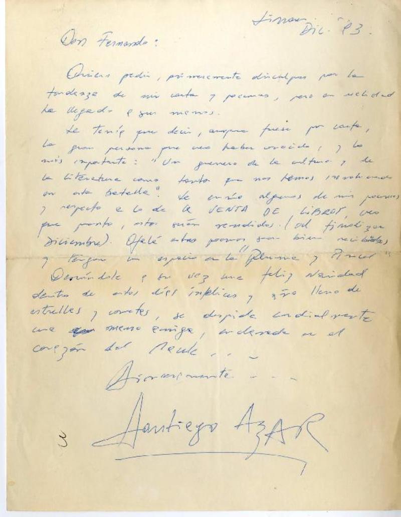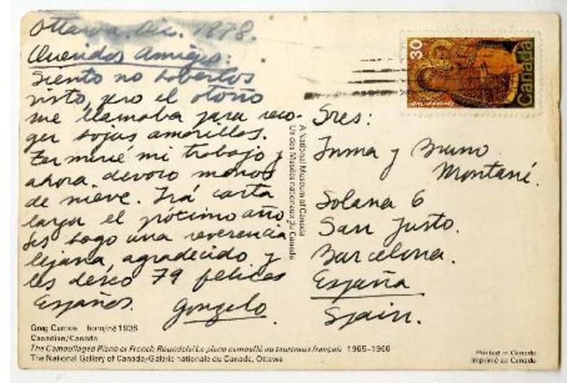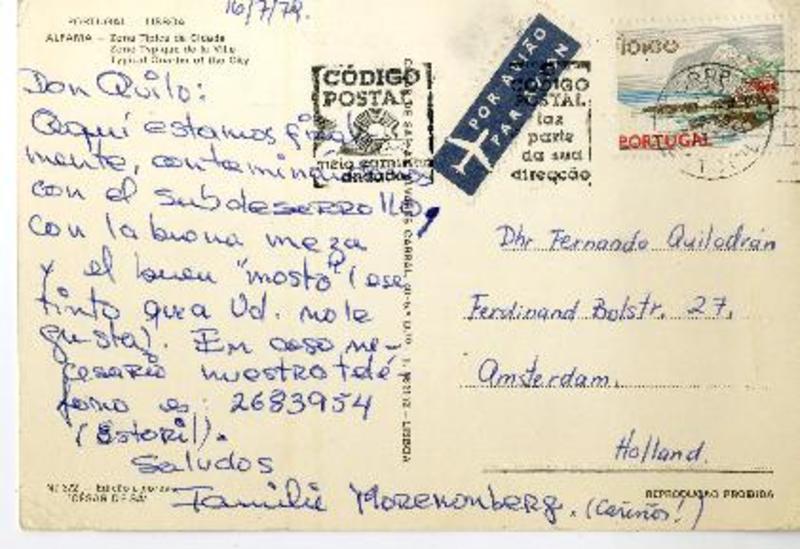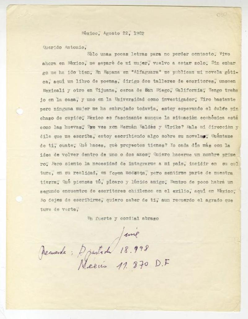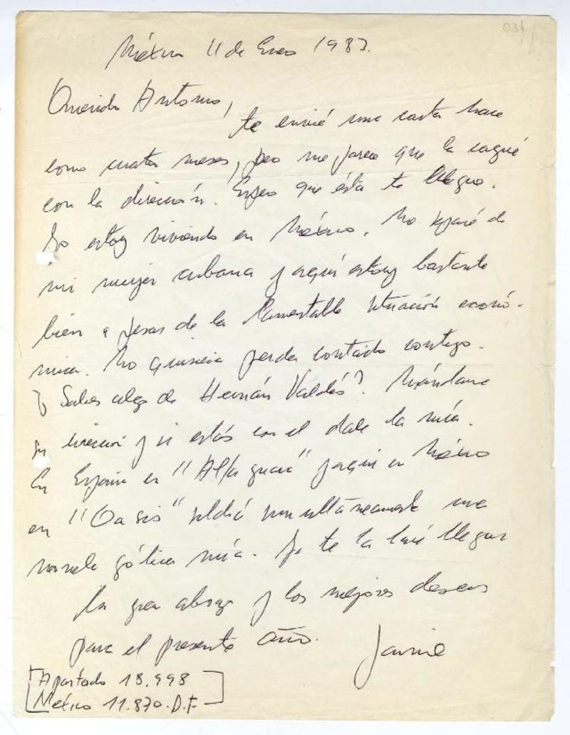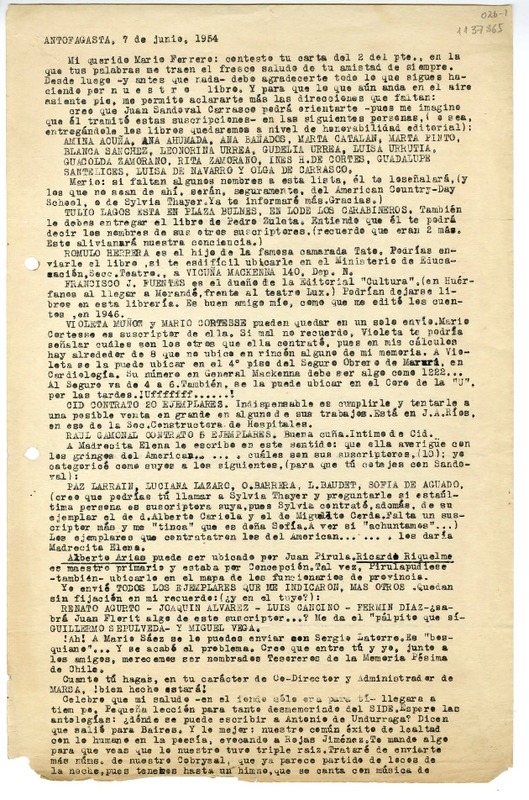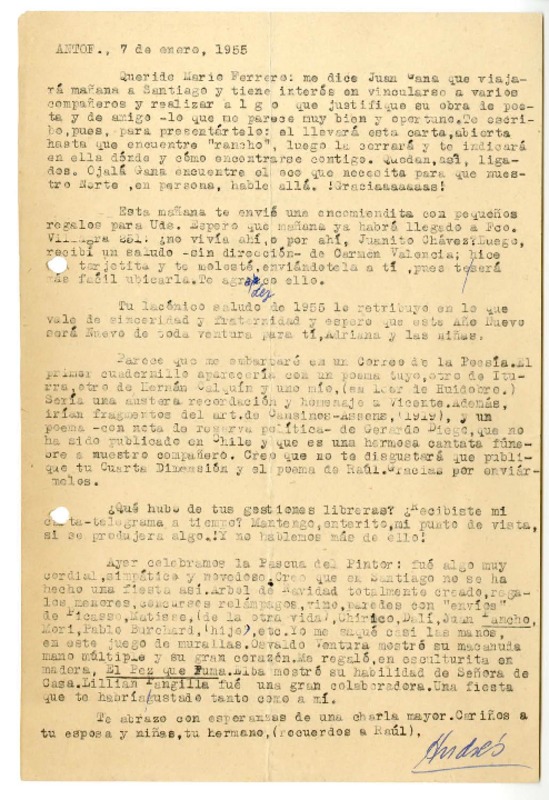 Antofagasta, Chile [a] Mario Ferrero Tarjeta, 1983 enero 19, [manuscrito] Andrés Sabella.